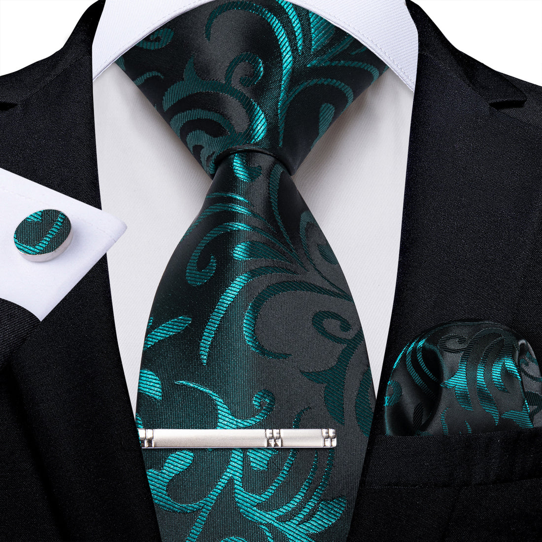 DiBanGu Silk Tie Black Teal Floral Men's Tie Handkerchief Cufflinks Clip Set