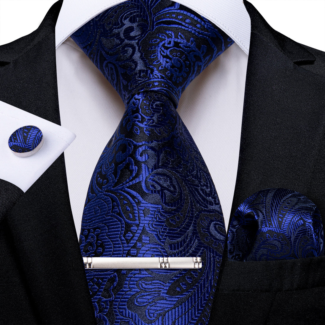 Blue Floral Men's Tie Handkerchief Cufflinks Clip Set