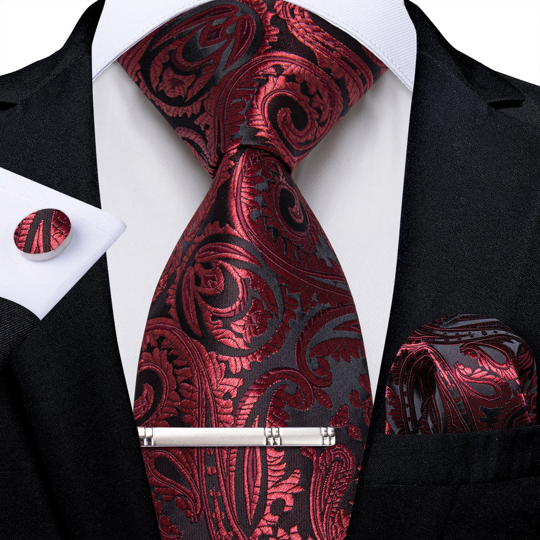 Black Claret Floral Men's Tie Handkerchief Cufflinks Clip Set