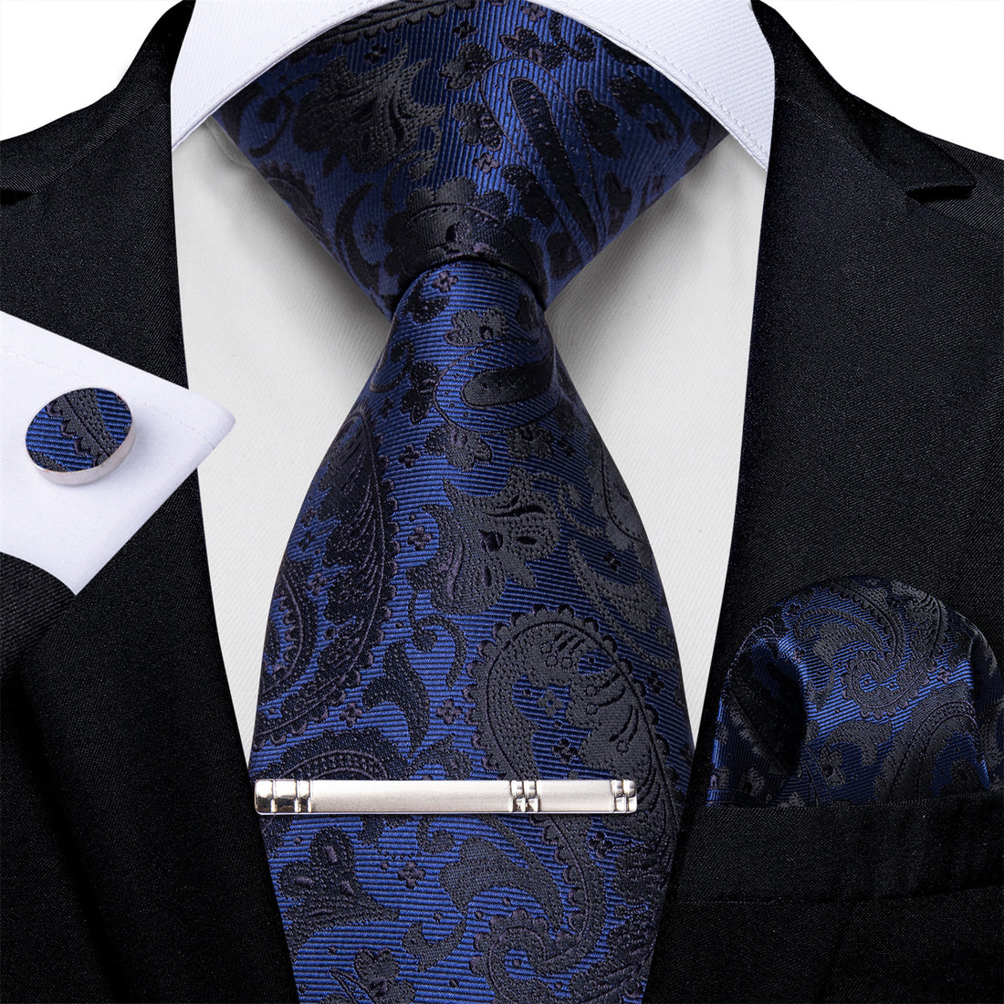 Blue Black Floral Men's Tie Handkerchief Cufflinks Clip Set