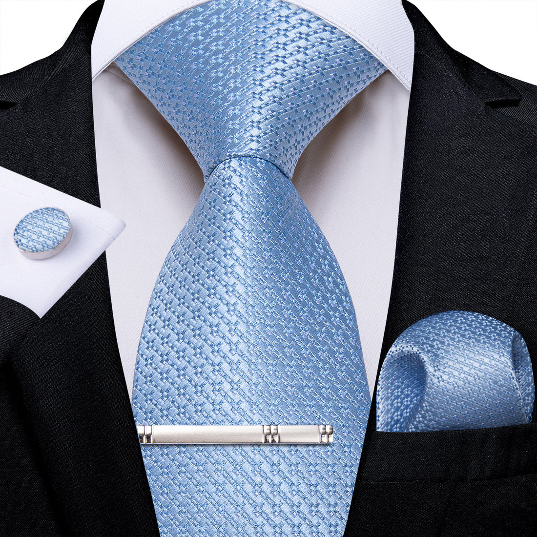 DiBanGu Silk Tie Light Blue Polka Dot Solid Men's Tie Handkerchief Cufflinks Clip Set