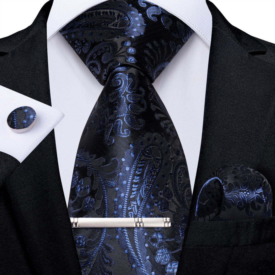 Blue Paisley Men's Tie Handkerchief Cufflinks Clip Set