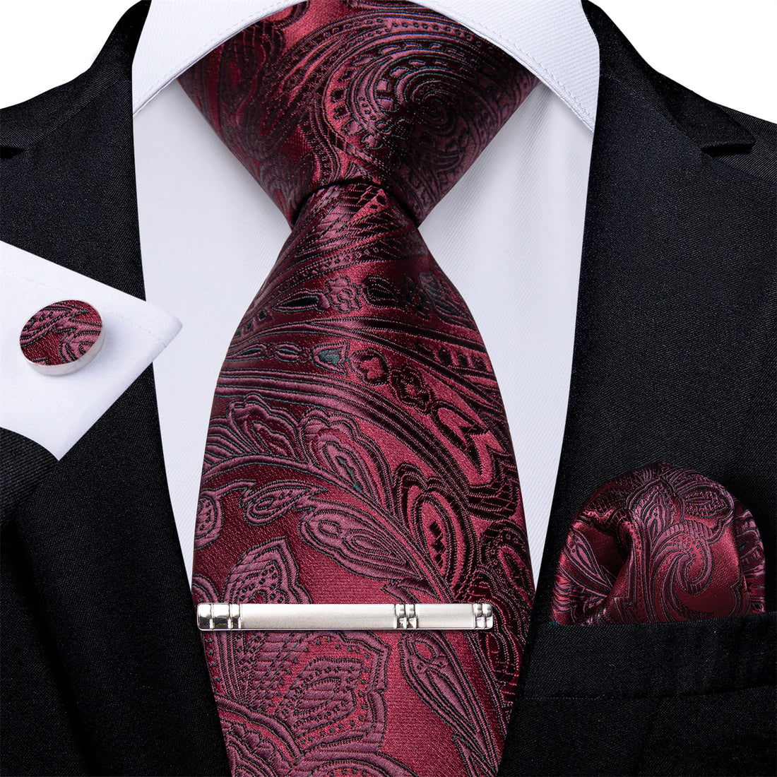 Claret Paisley Men's Tie Handkerchief Cufflinks Clip Set