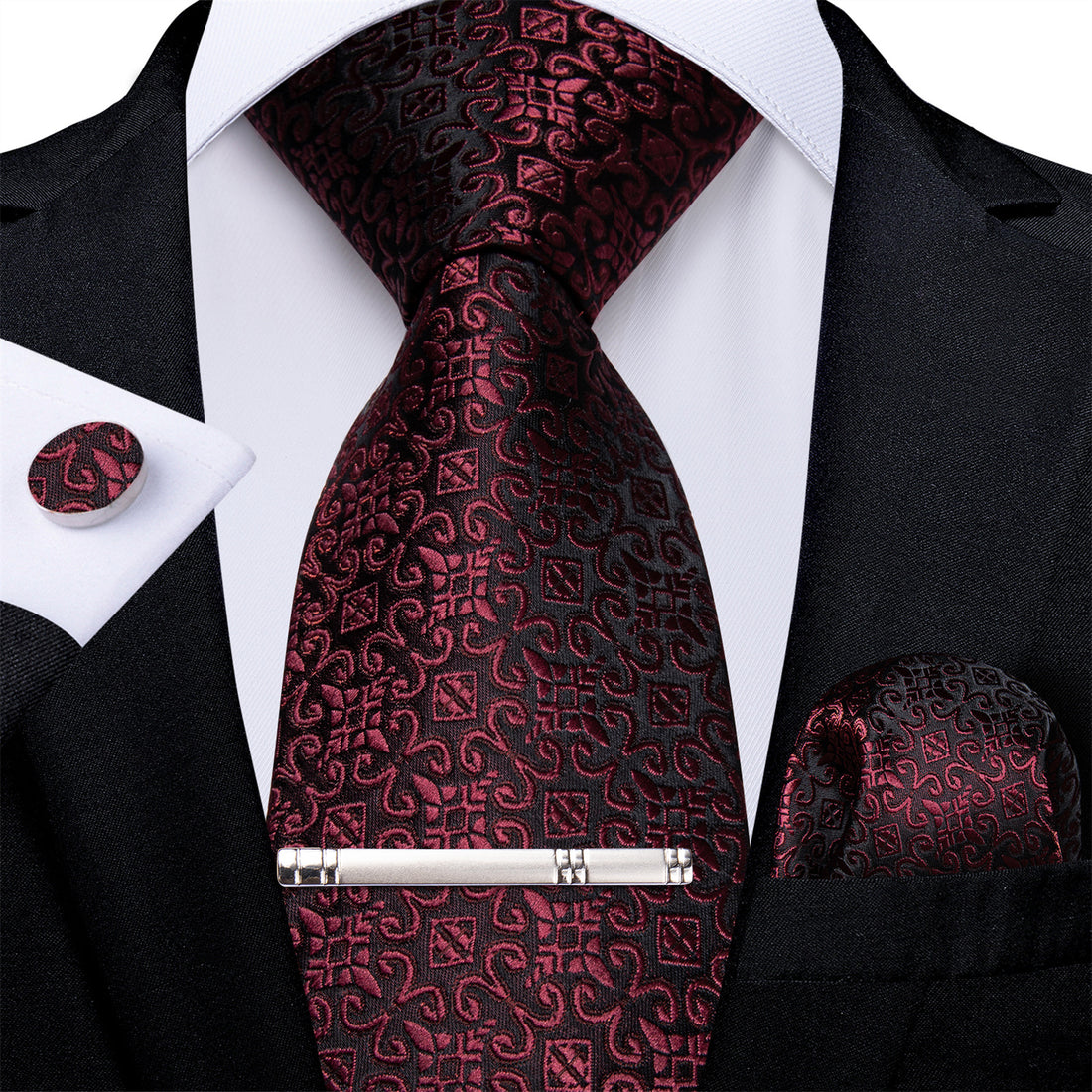 Claret Floral Men's Tie Handkerchief Cufflinks Clip Set
