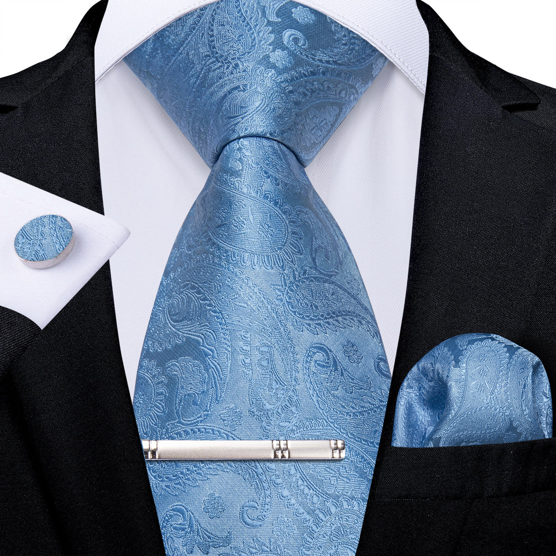Baby Blue Men's Tie Handkerchief Cufflinks Clip Set