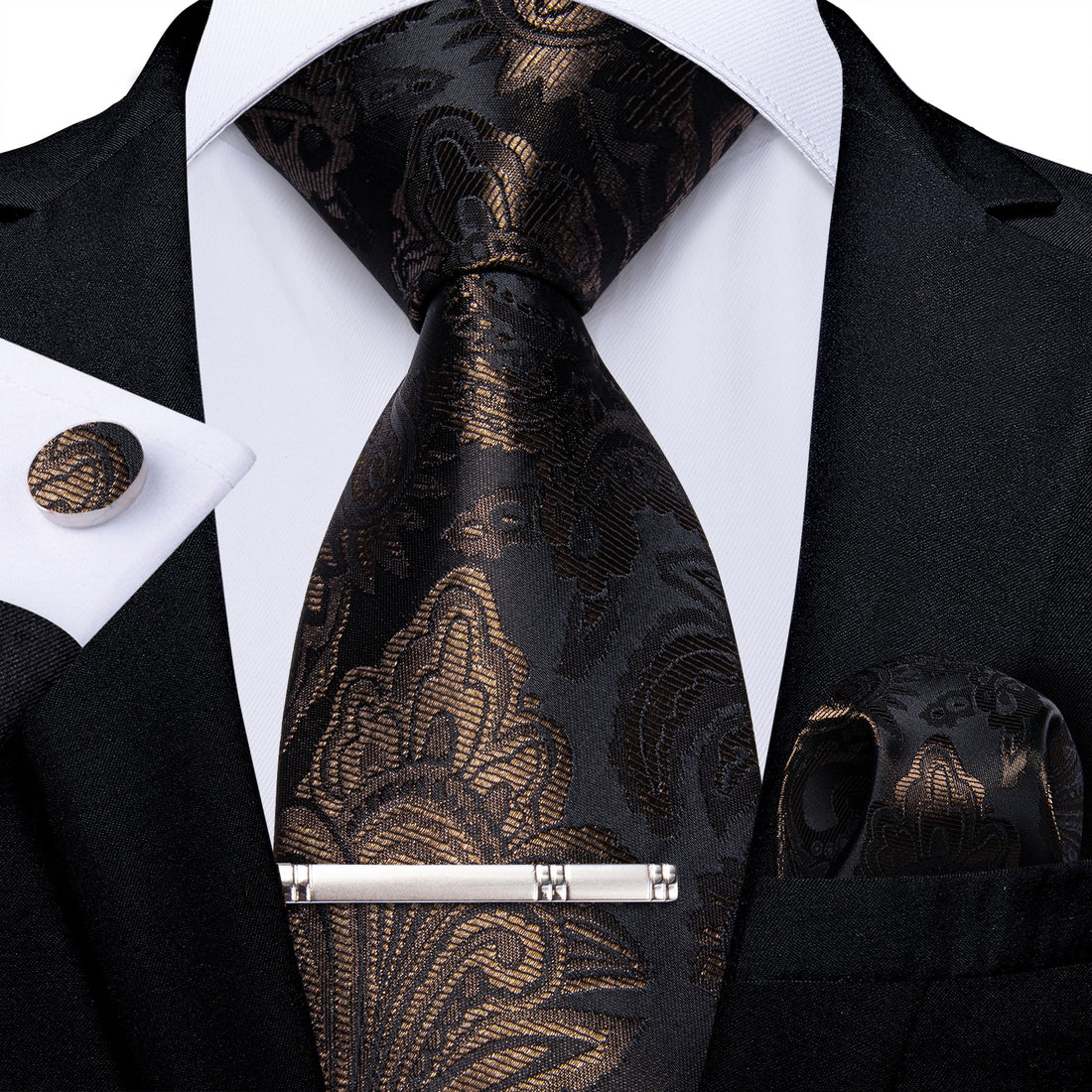 Black Claret Floral Men's Tie Handkerchief Cufflinks Clip Set