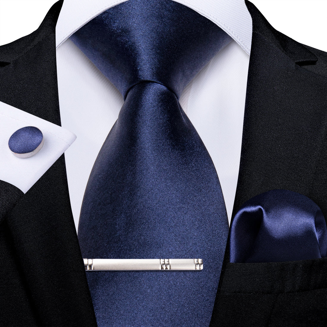 Dark Blue Solid Men's Tie Pocket Square Cufflinks Clip Set