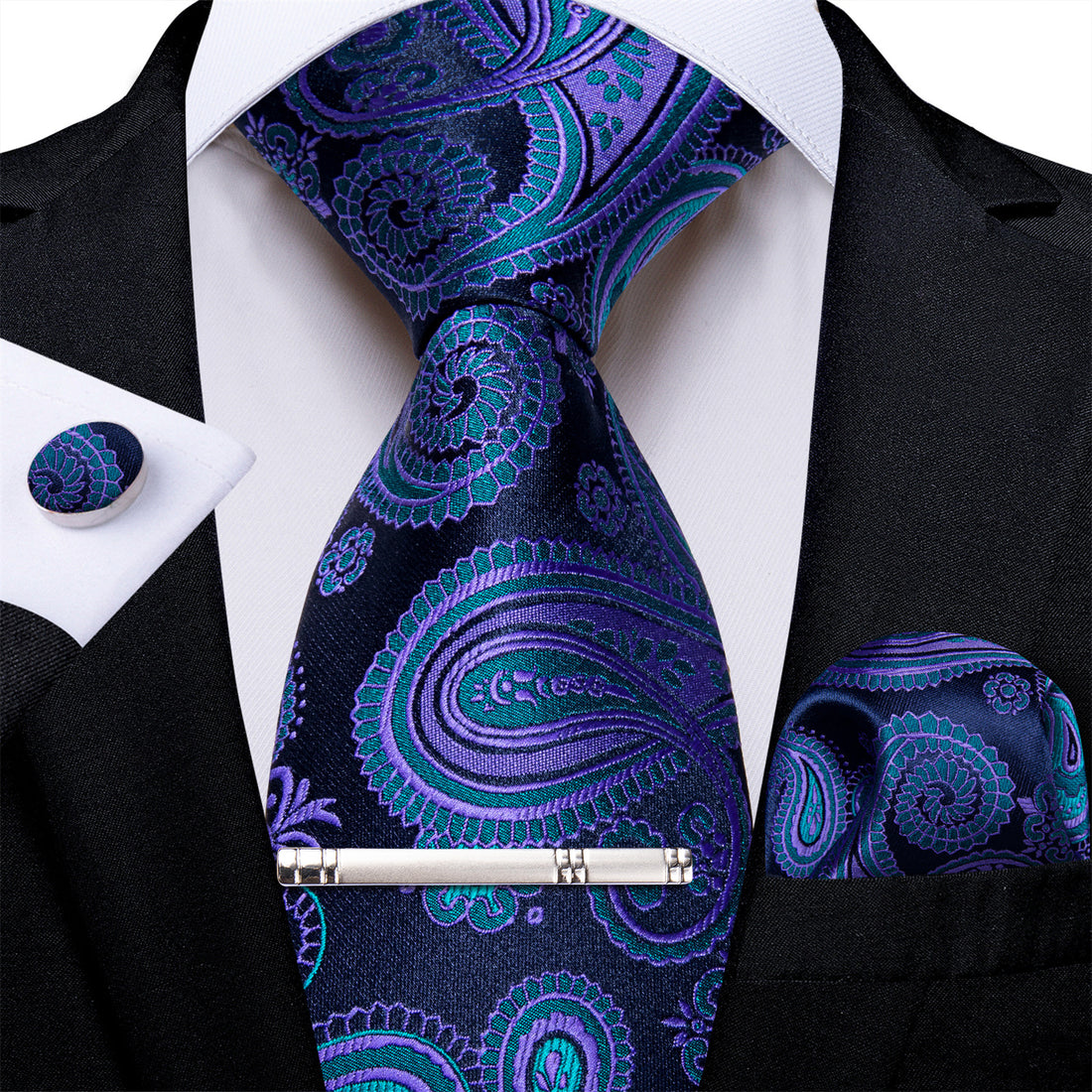 Blue Paisley Men's Tie Handkerchief Cufflinks Clip Set