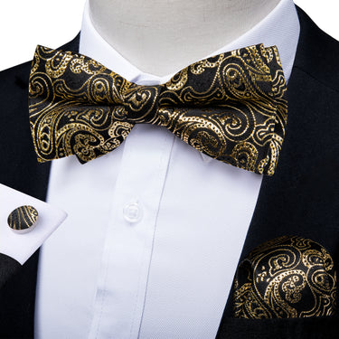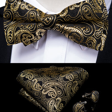 Black Gold Paisley Silk Bowtie Pocket Square Cufflinks Set