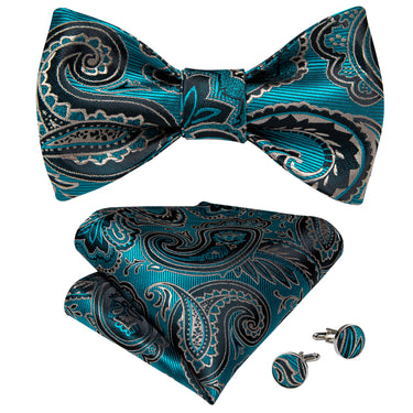 Teal Blue Yellow Self-Bowtie Paisley Pocket Square Cufflinks Set
