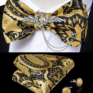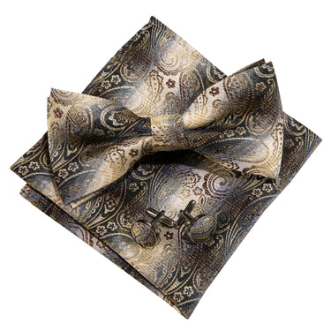 Golden Black Paisley Silk Bowtie Pocket Square Cufflinks Set