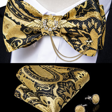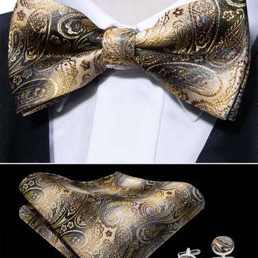 Gold Black Paisley Self-Bowtie Pocket Square Cufflinks Set
