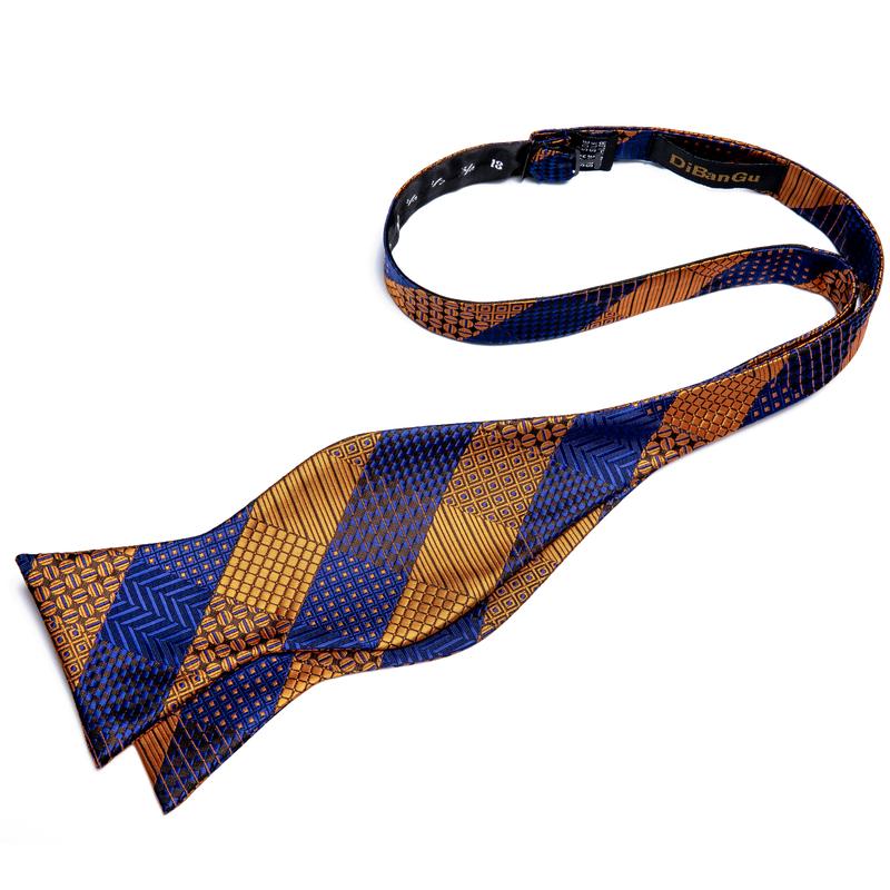 DiBanGu Self-Bow Tie Yellow Blue Plaid Men's Silk Bowtie Pocket Square Cufflinks Set
