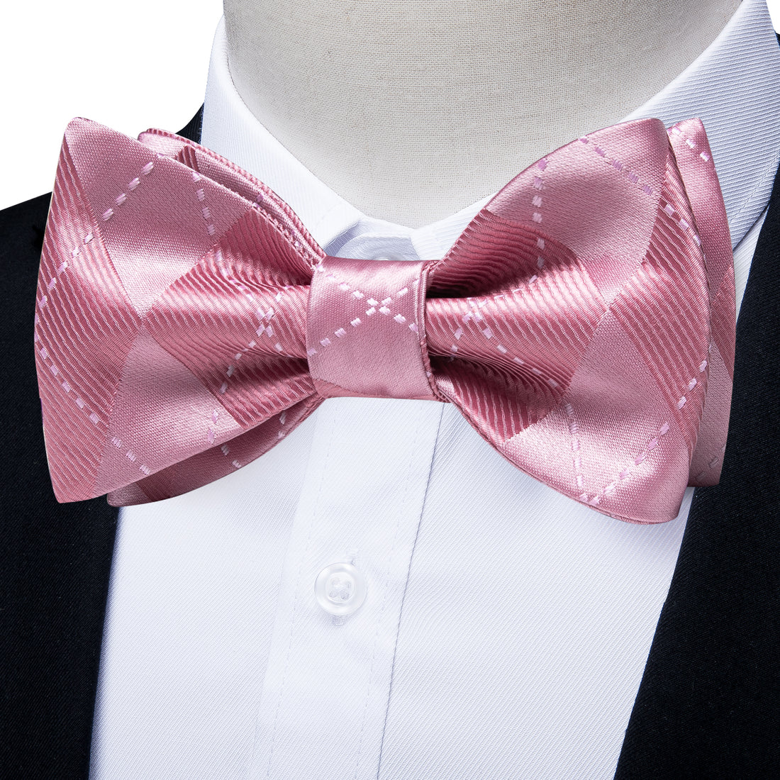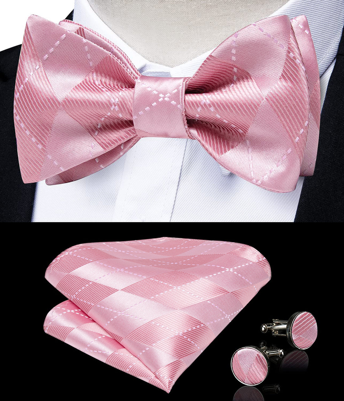Pink Plaid Self-Bowtie Pocket Square Cufflinks Set