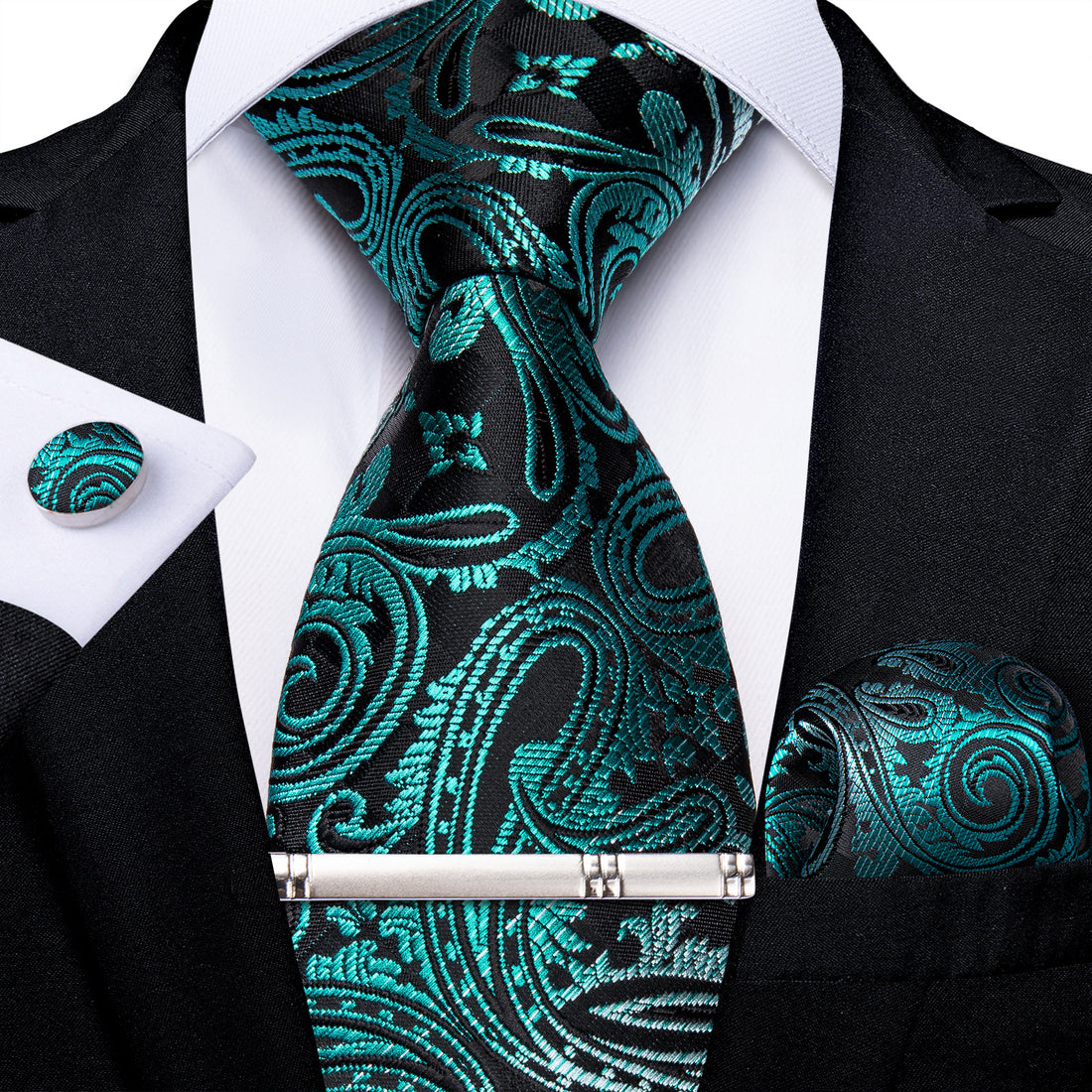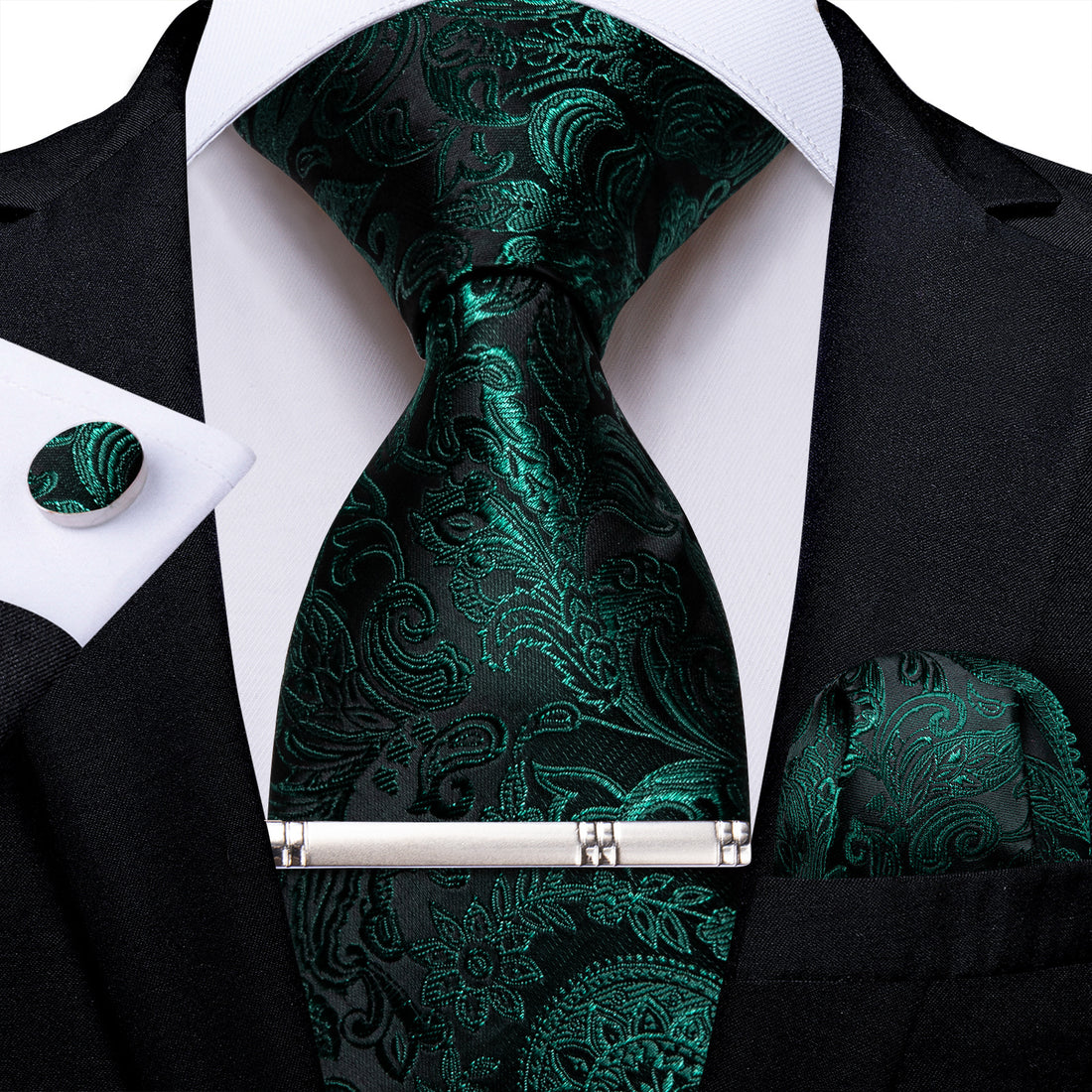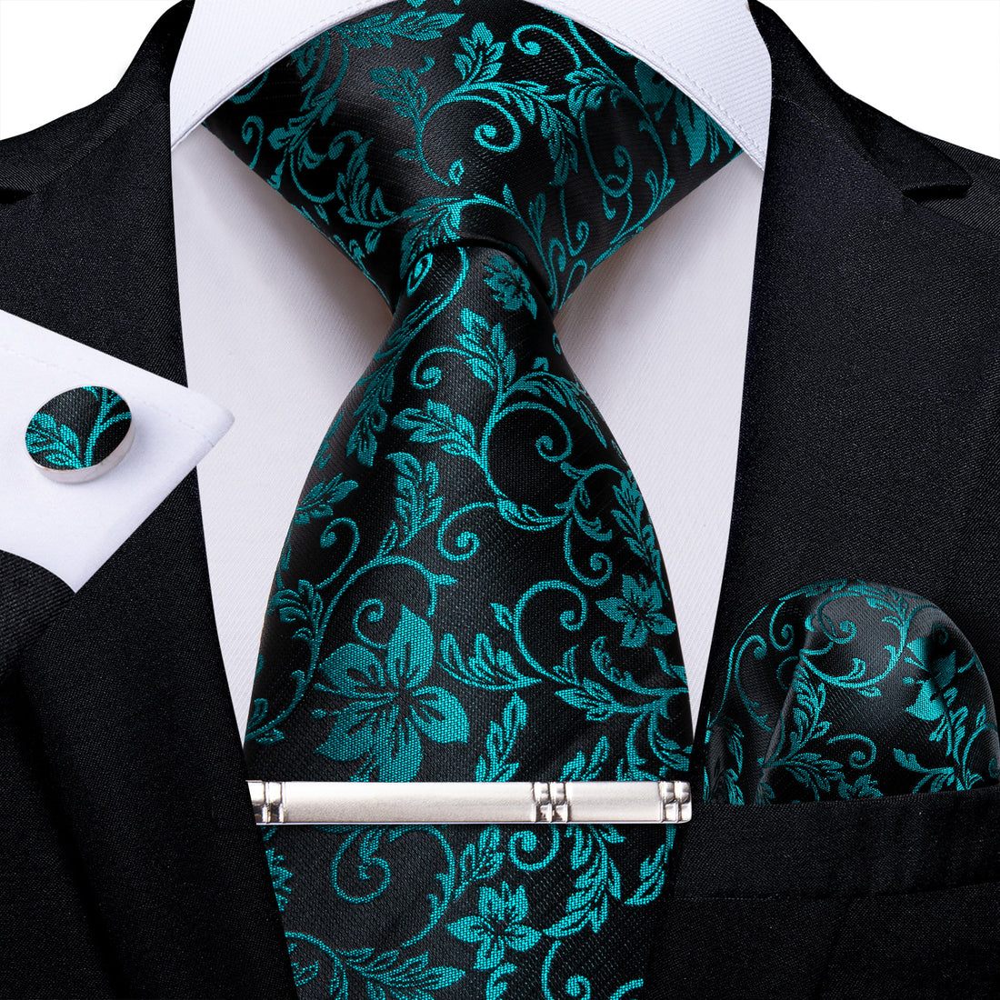 Black Green Floral Men's Tie Handkerchief Cufflinks Clip Set