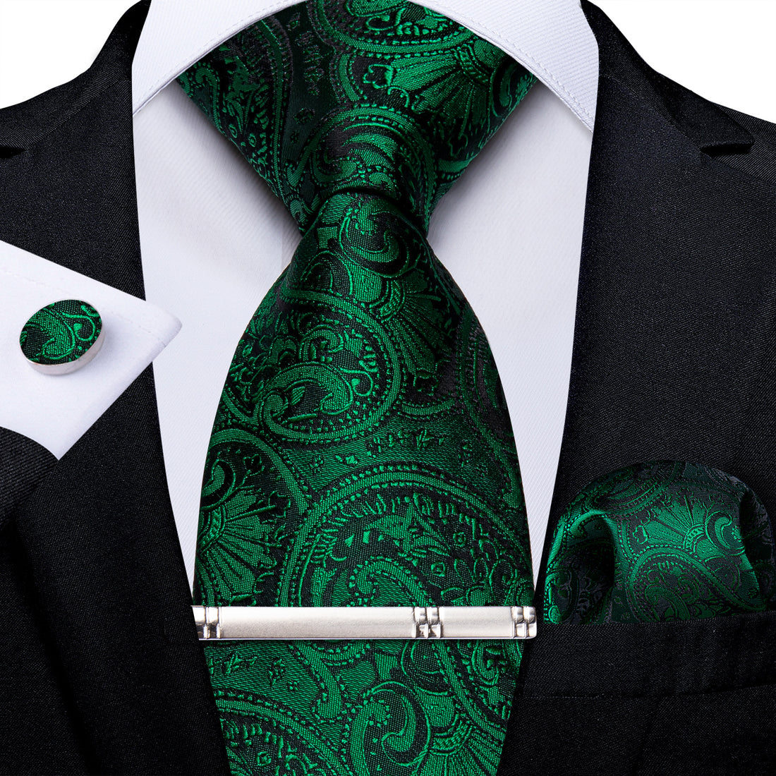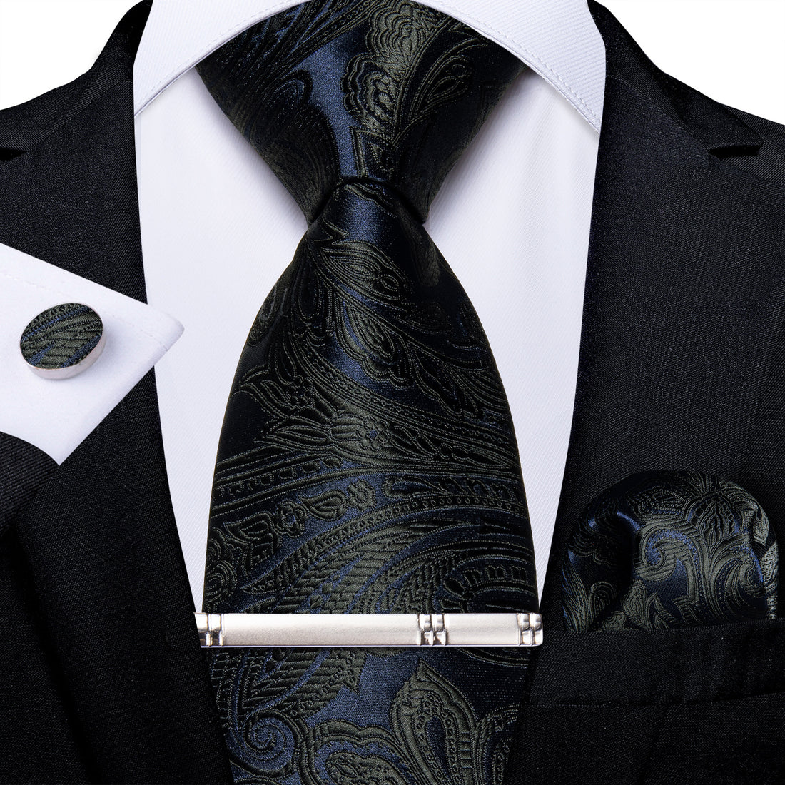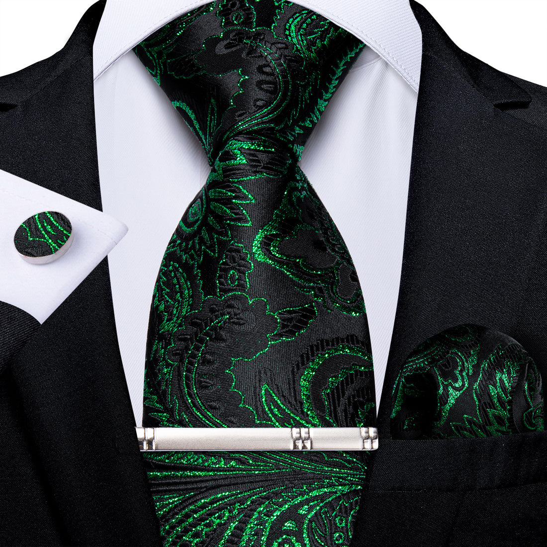Classy Black Green Gold Floral Men's Tie Pocket Square Cufflinks Clip Set