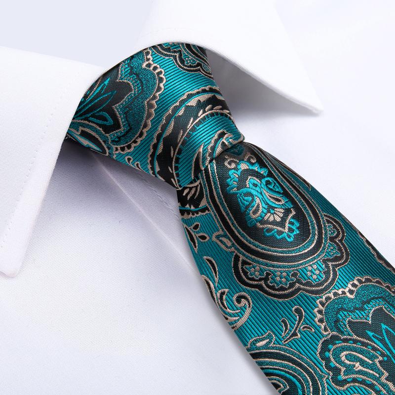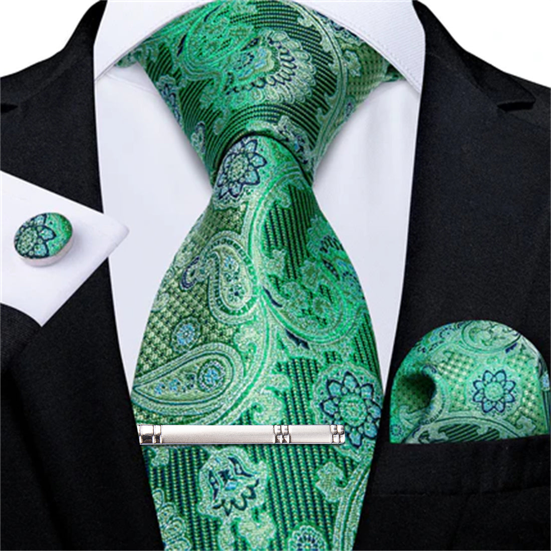 Green Black Paisley Men's Tie Handkerchief Cufflinks Clip Set