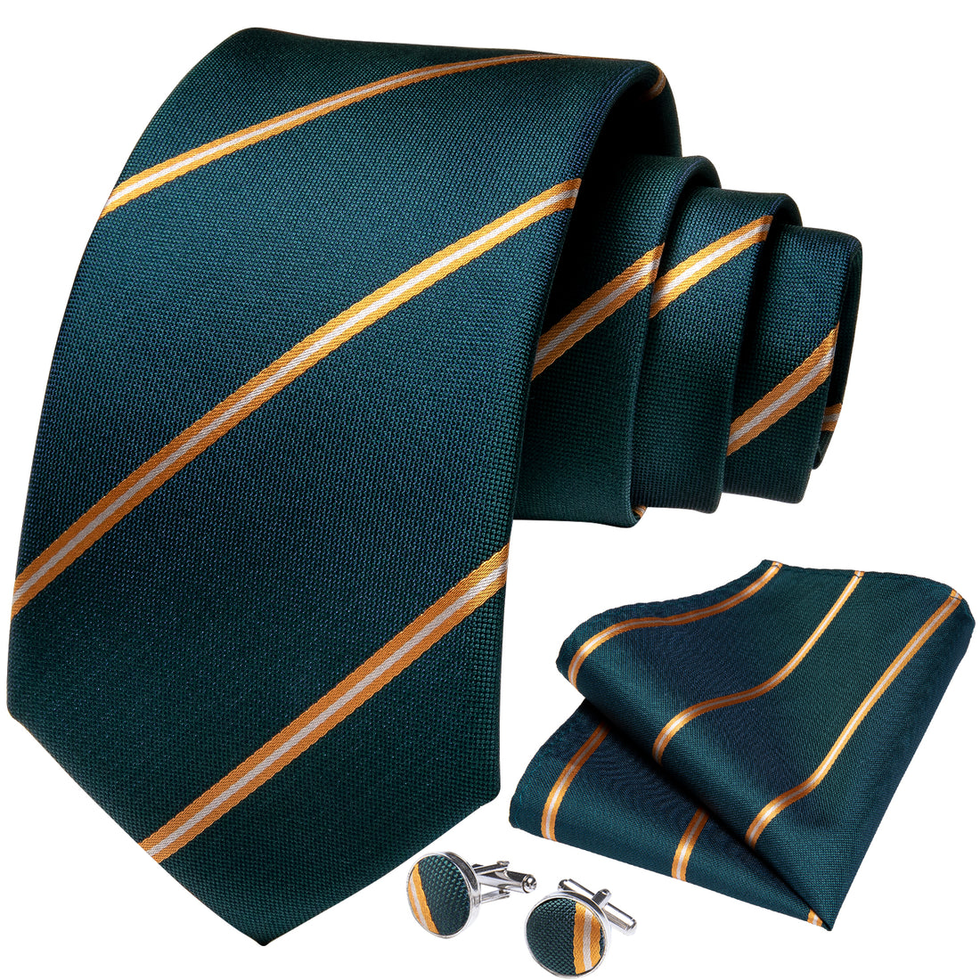 Green Striped Necktie Handkerchief Cufflinks Clip Set
