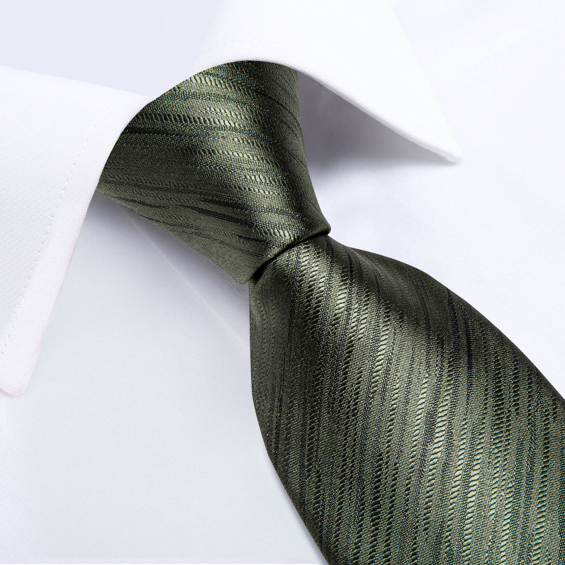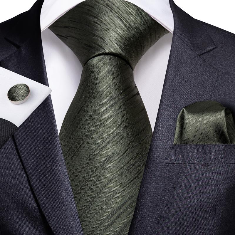 Olive Green Striped Silk Men's Necktie Handkerchief Cufflinks Set With Lapel Pin Brooch Set