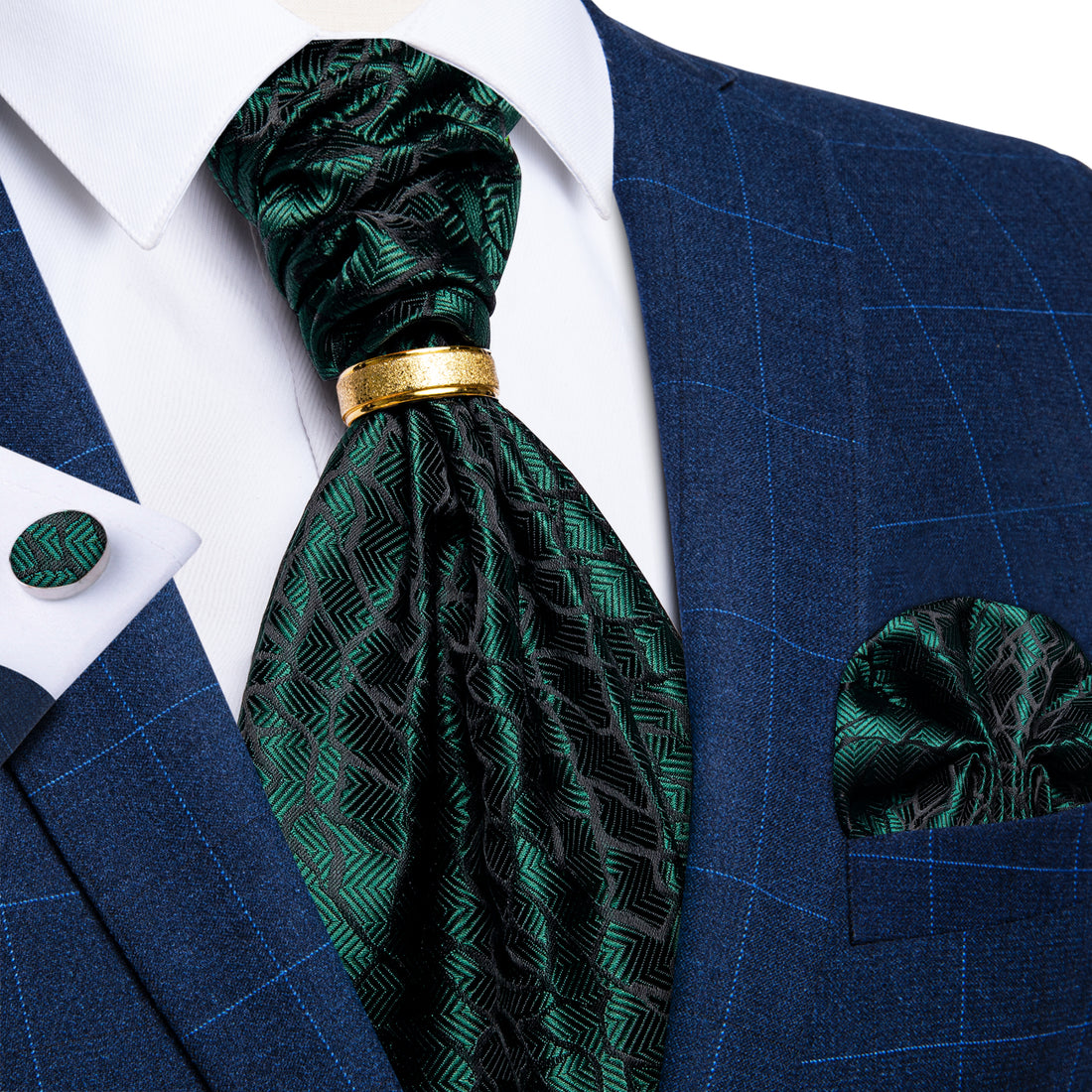 Green Black Texture Silk Cravat Woven Ascot Tie Pocket Square Handkerchief with Tie Ring Set