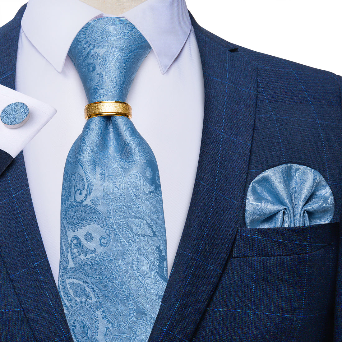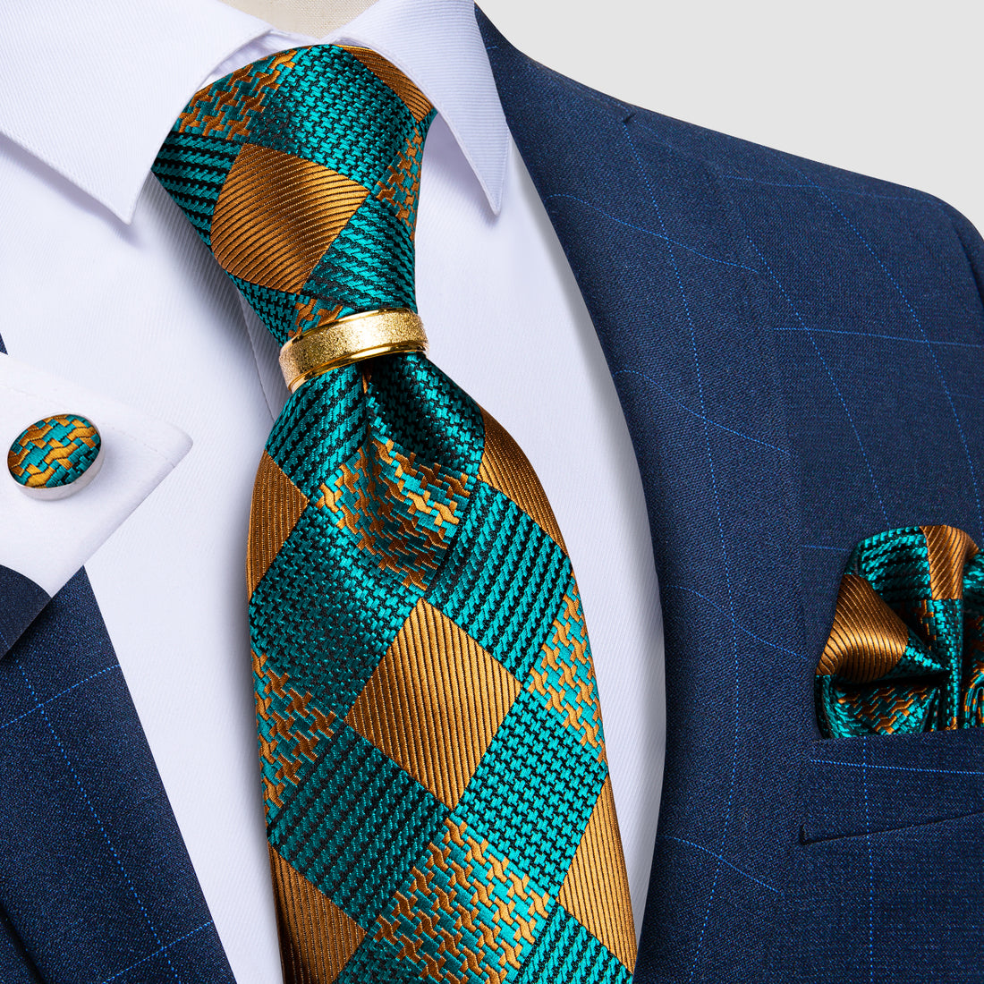 4PCS Teal Blue Plaid Silk Men's Tie Pocket Square Cufflinks with Tie Ring Set