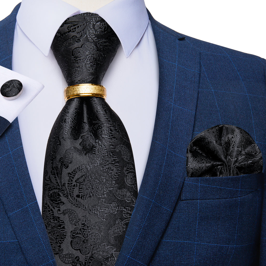 4PCS Black Floral Men's Silk Tie Pocket Square Cufflinks with Tie Ring Set