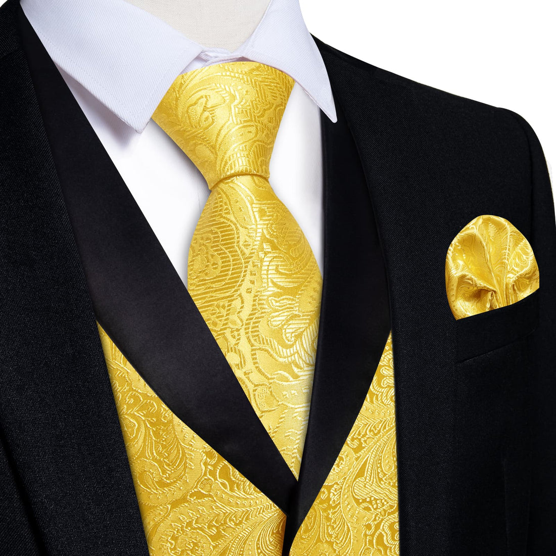 DiBanGu Flavescent Yellow Floral Silk Shawl Collar Mens Dress Vest Tie Set