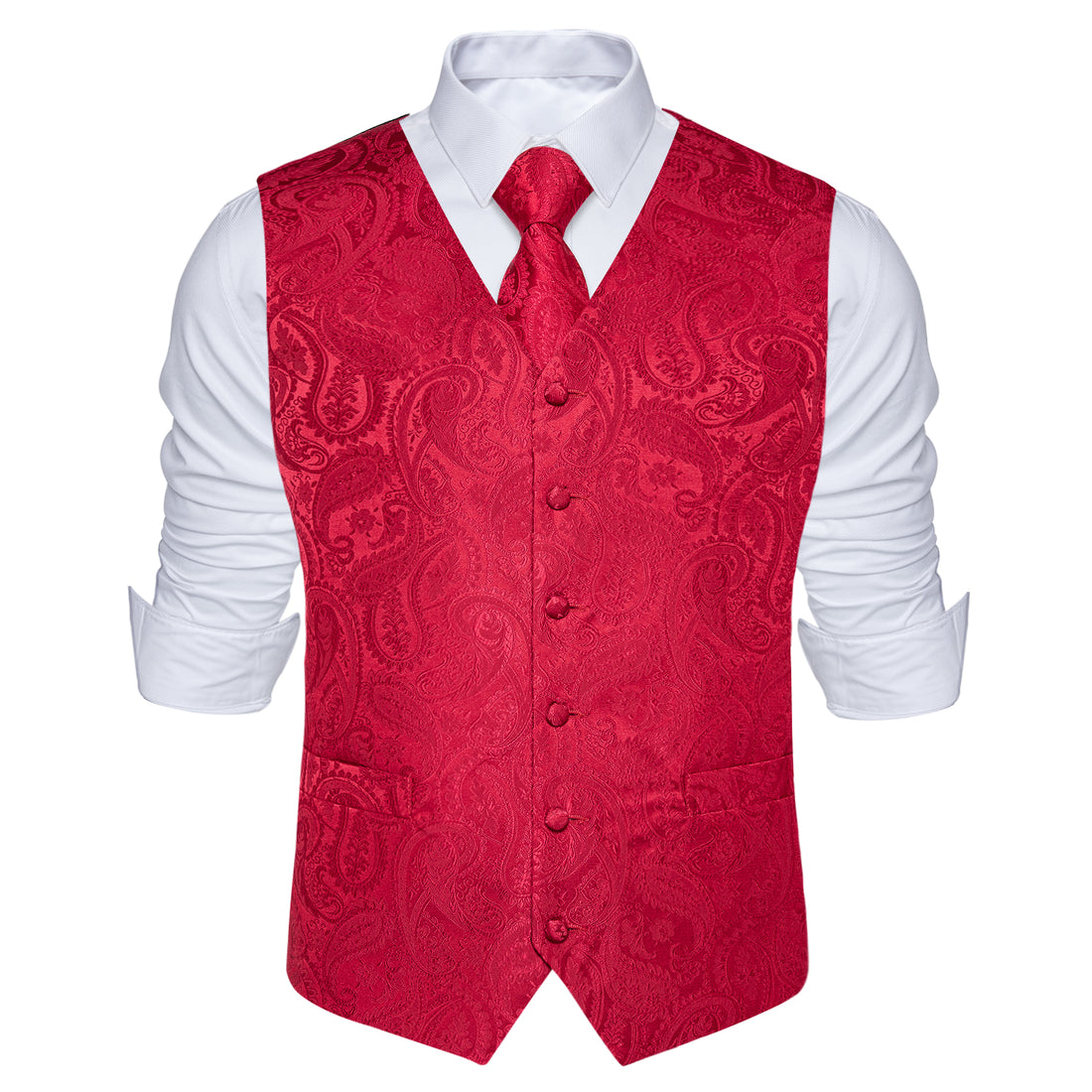 Red Paisley Jacquard Silk Waistcoat Vest Necktie Handkerchief Cufflinks Set