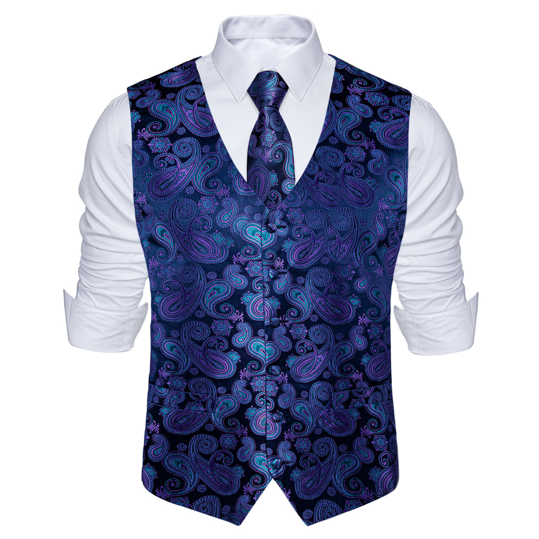 DiBanGu Mens Suit Vest Blue Purple Paisley Silk Waistcoat Vest Tie Handkerchief Cufflinks Set