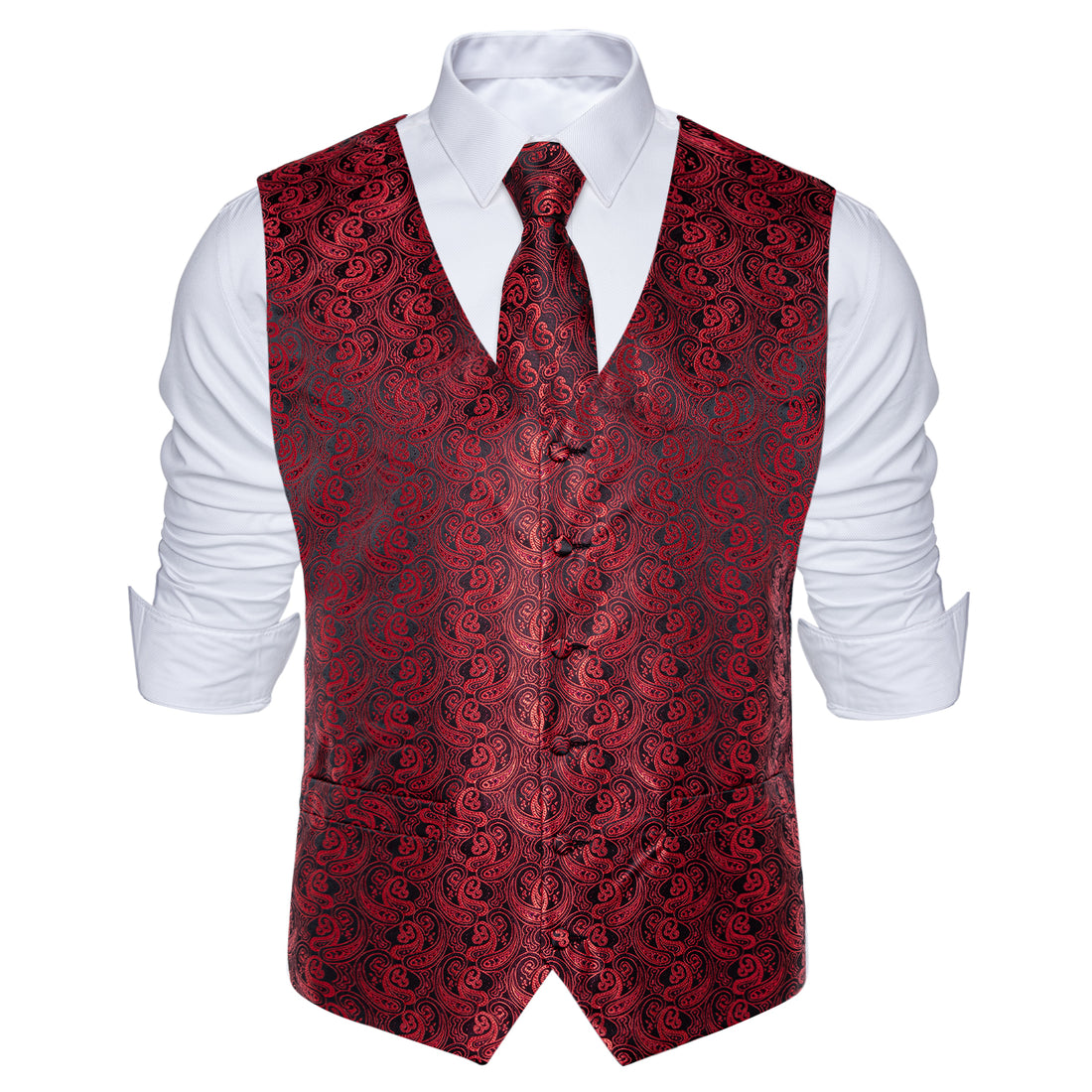 DiBanGu Mens Suit Vest Deep Red Paisley Jacquard Silk Waistcoat Vest Tie Pocket Square Cufflinks Set