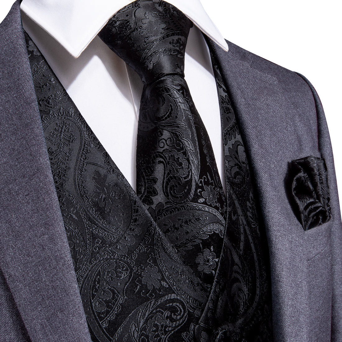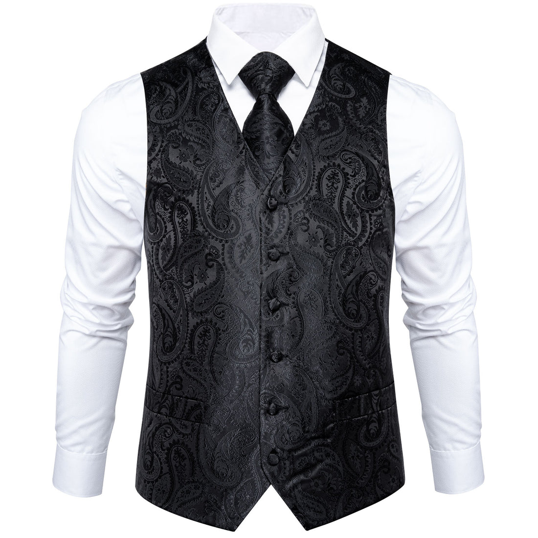 DiBanGu Mens Suit Vest Black Paisley Jacquard Silk Waistcoat Vest Tie Handkerchief Cufflinks Set