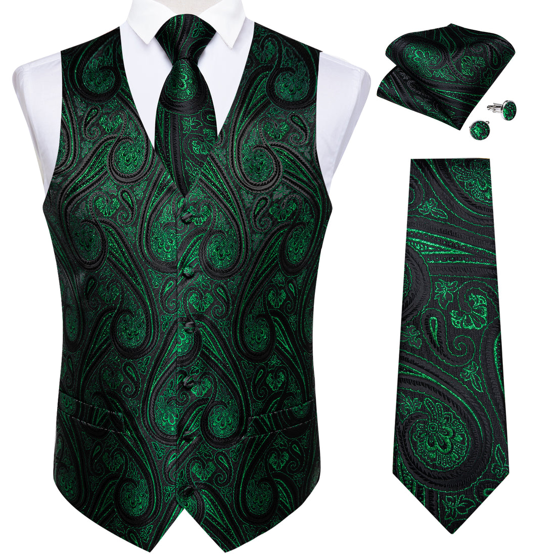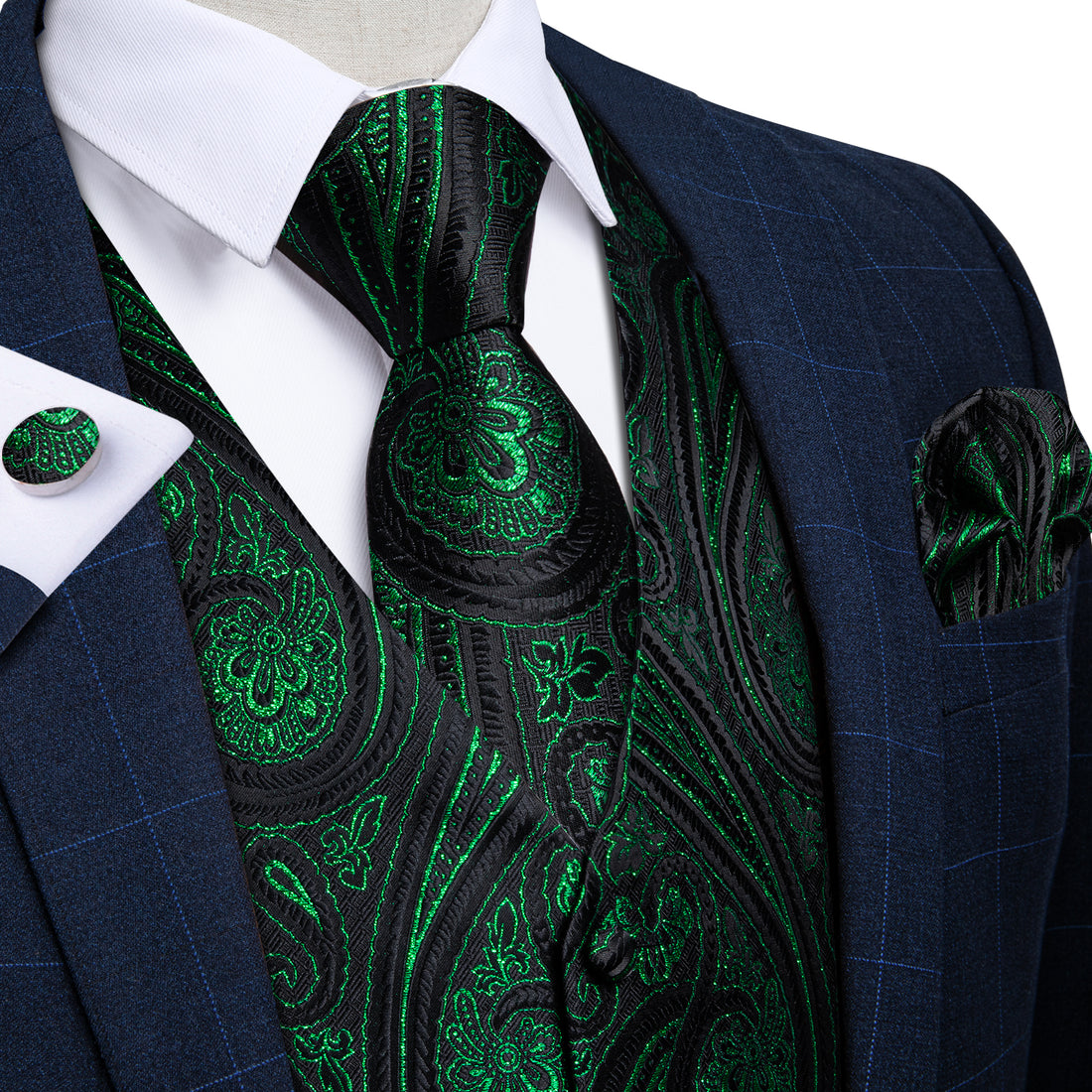 Men's Classic Black Green Floral Jacquard Silk Waistcoat Vest Tie Handkerchief Cufflinks Suit Set