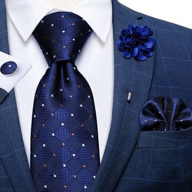 Blue White Plaid Men's Tie Handkerchief Cufflinks with Lapel Pin Brooch Set