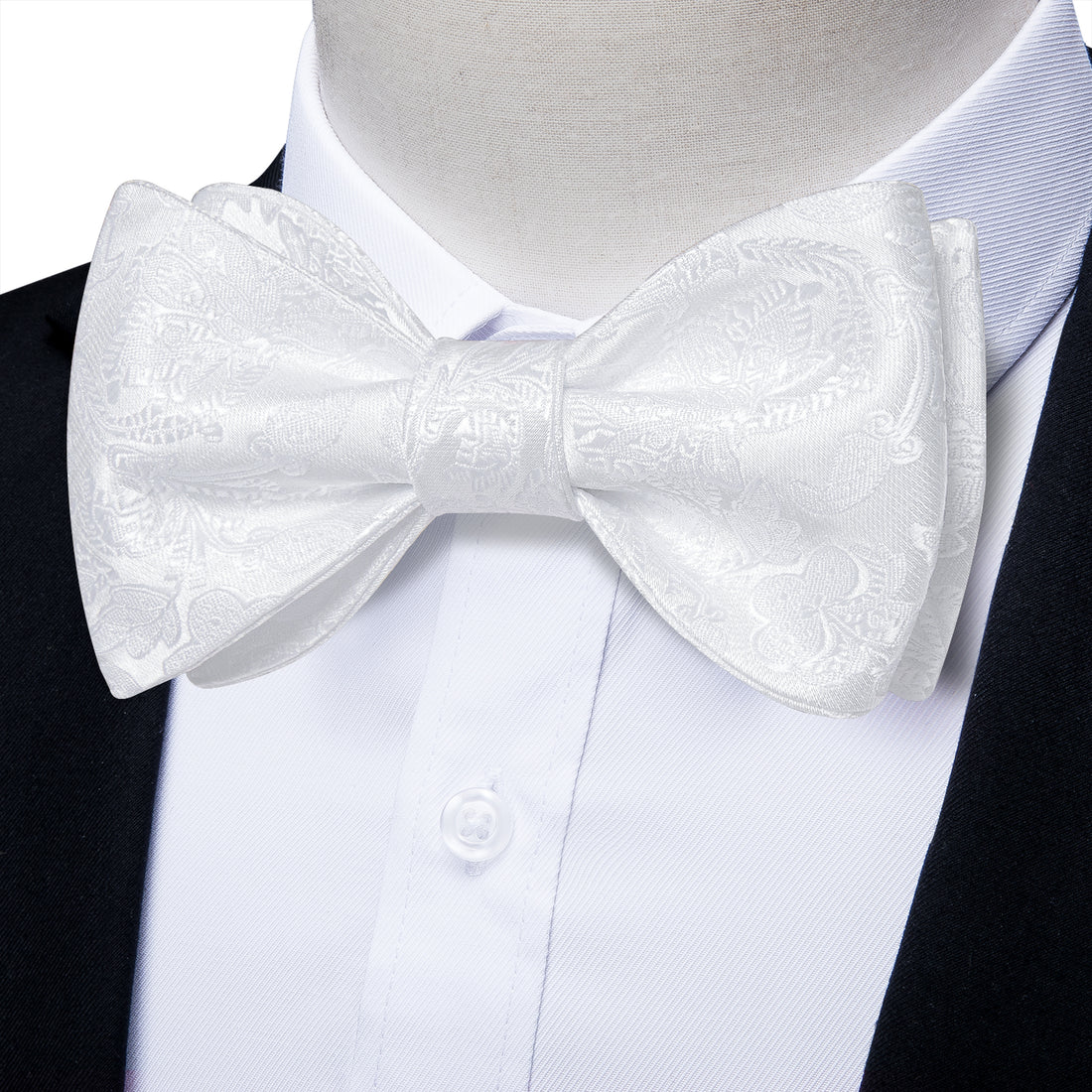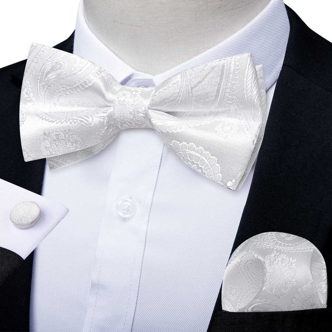White Floral Silk Men's Pre-Bowtie Pocket Square Cufflinks Set