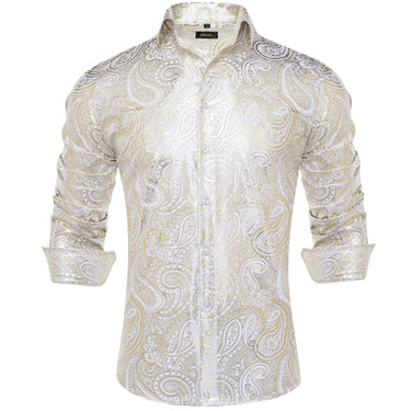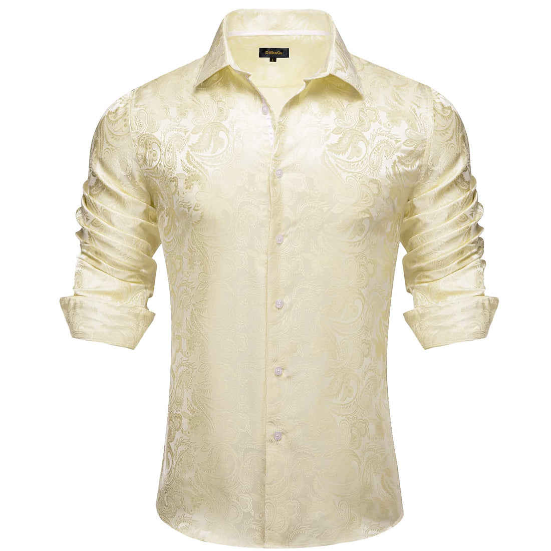 DiBanGu Shirt for Men Light Yellow Paisley Long Sleeve Silk Button Up Shirt