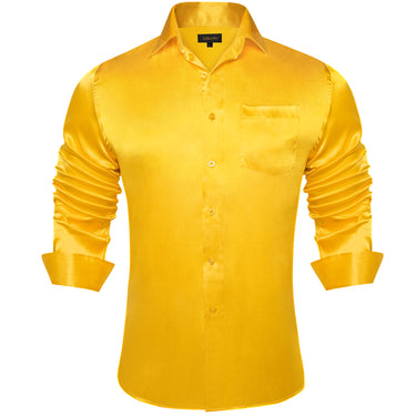 DiBanGu Mens Dress Shirt Solid Honey Yellow Splicing Silk Long Sleeve Shirt
