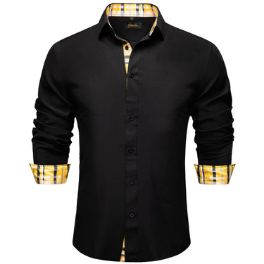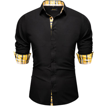 DiBanGu Men's Shirt Black Solid Yellow Plaid Splicing Dress Silk Shirt