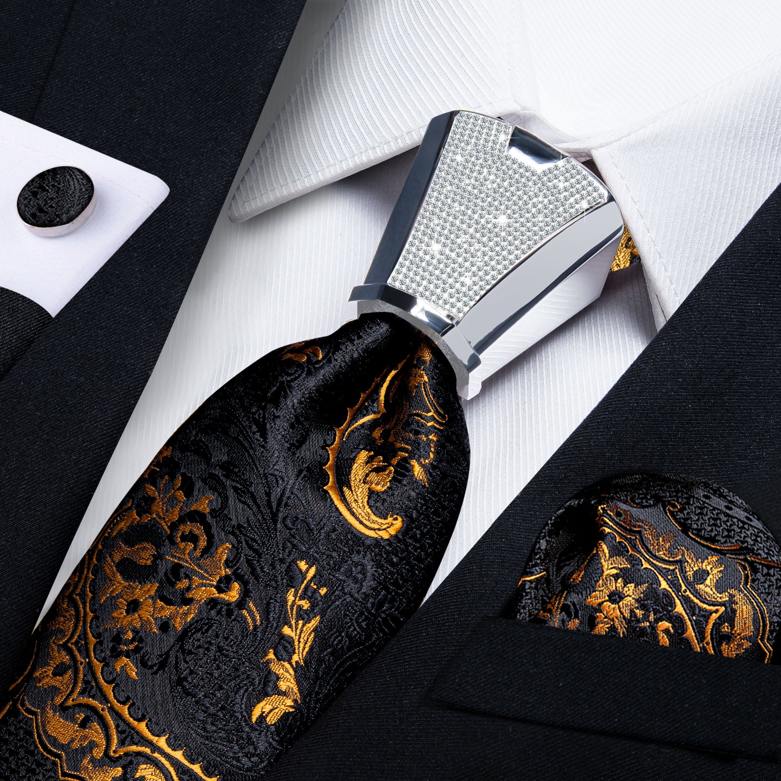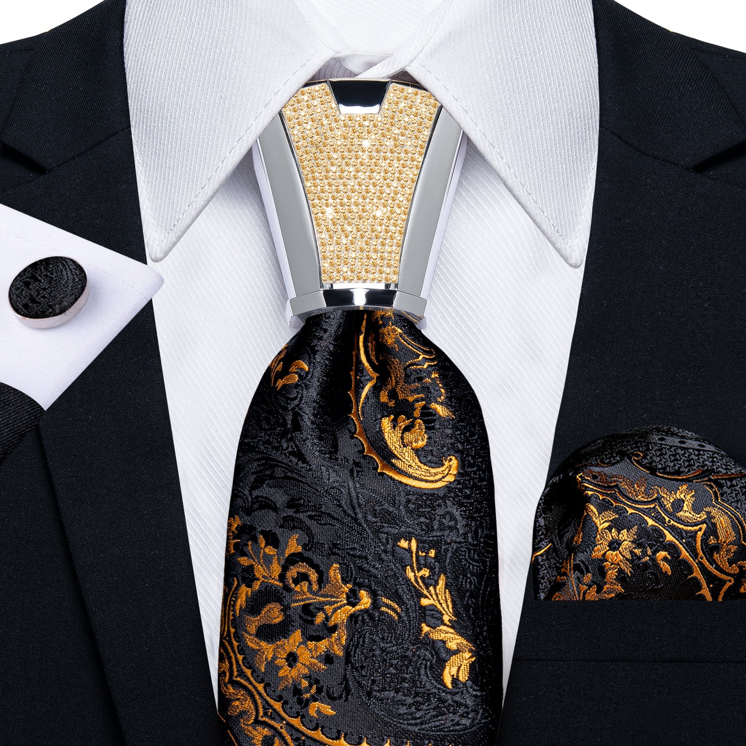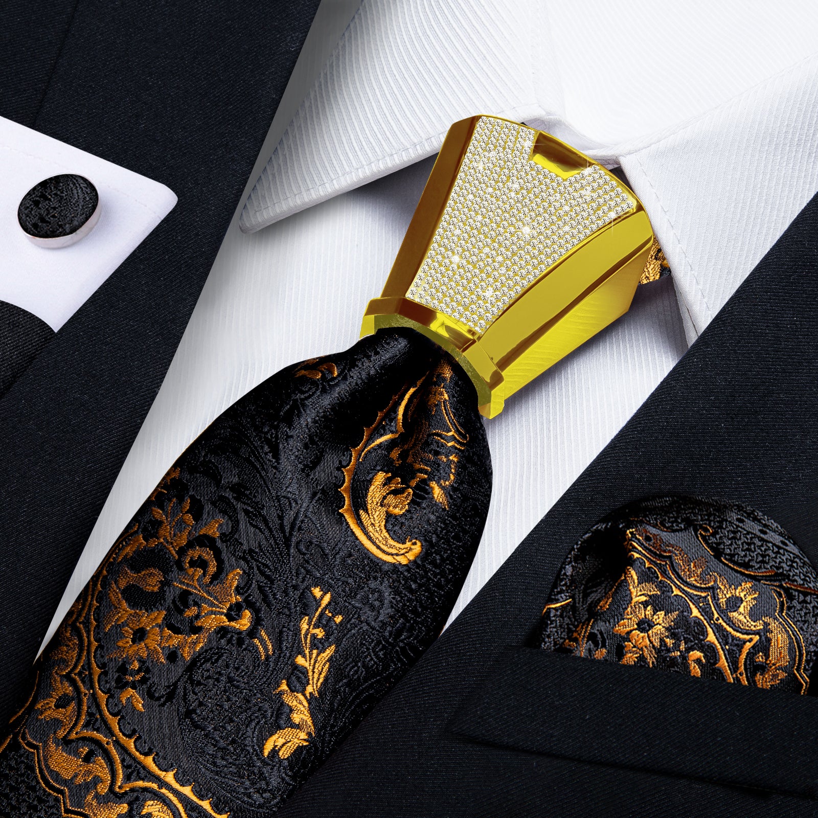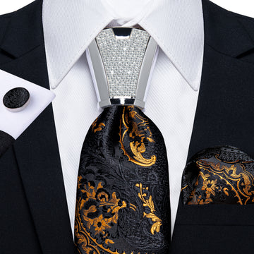 4PCS Black Gold Floral Silk Men's Tie Handkerchief Cufflinks Accessory Set