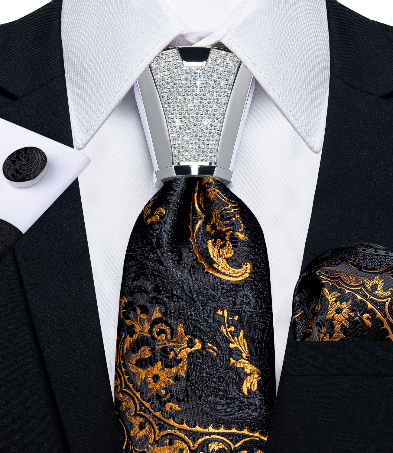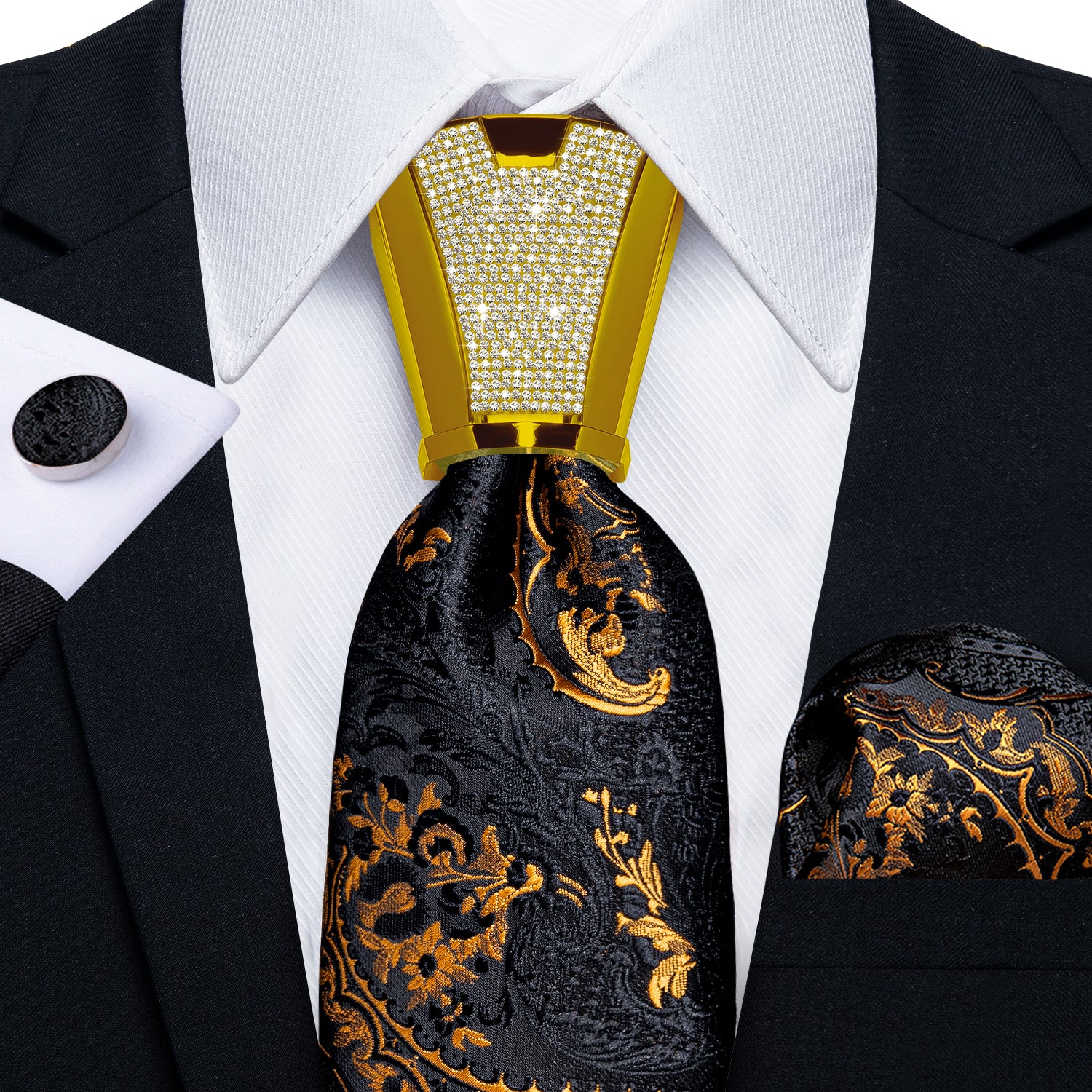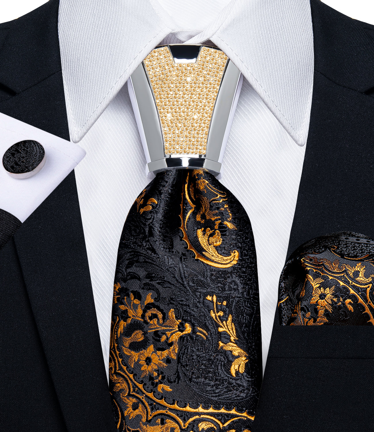 4PCS Black Gold Floral Silk Men's Tie Handkerchief Cufflinks Accessory Set