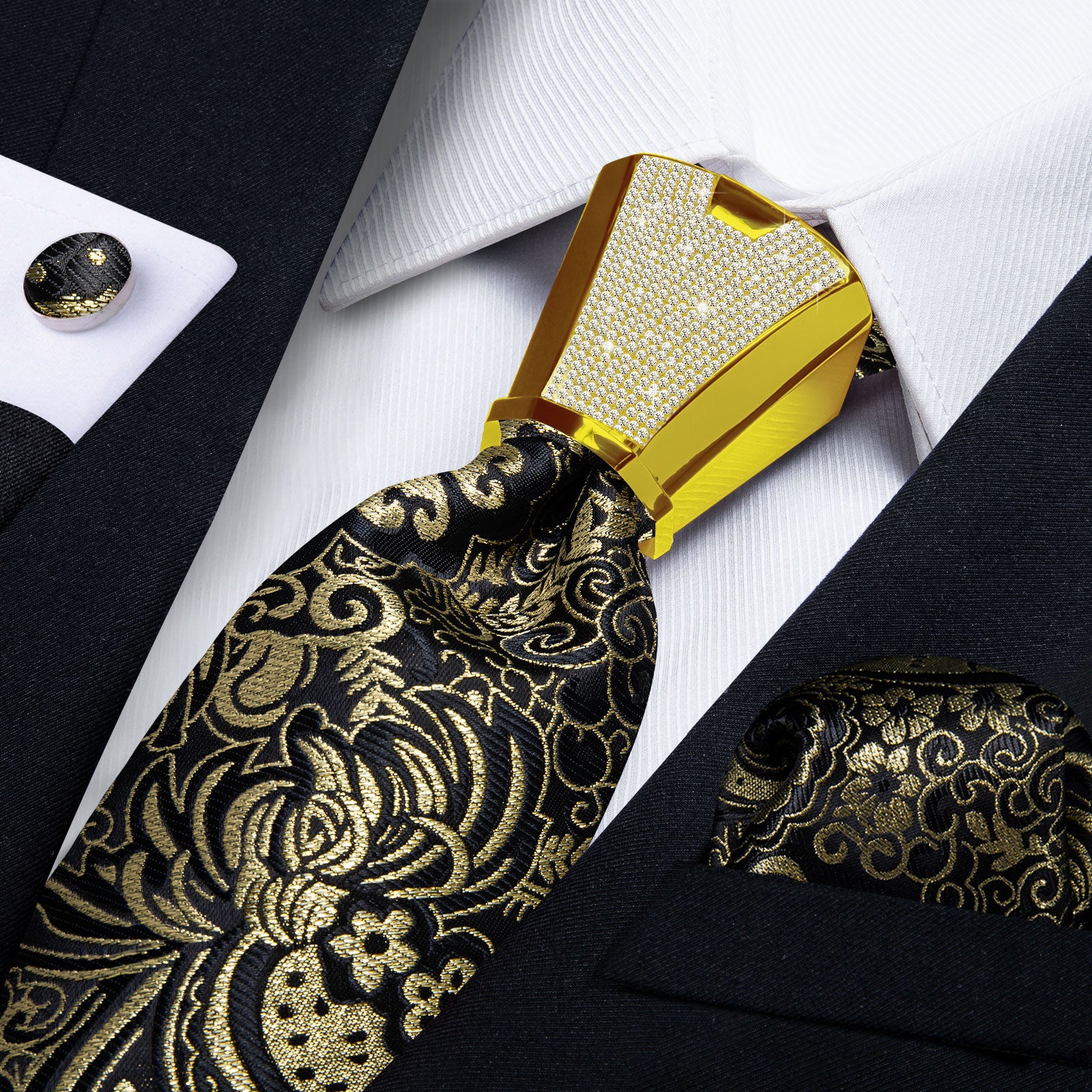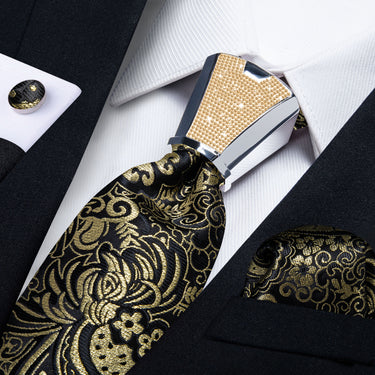 4PCS Black Golden Floral Men's Tie Handkerchief Cufflinks Accessory Set