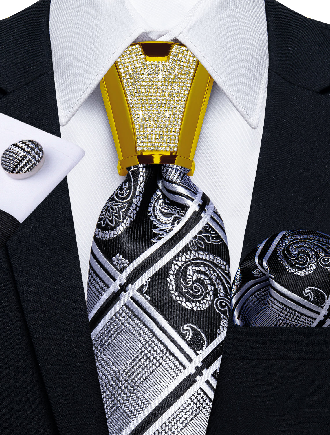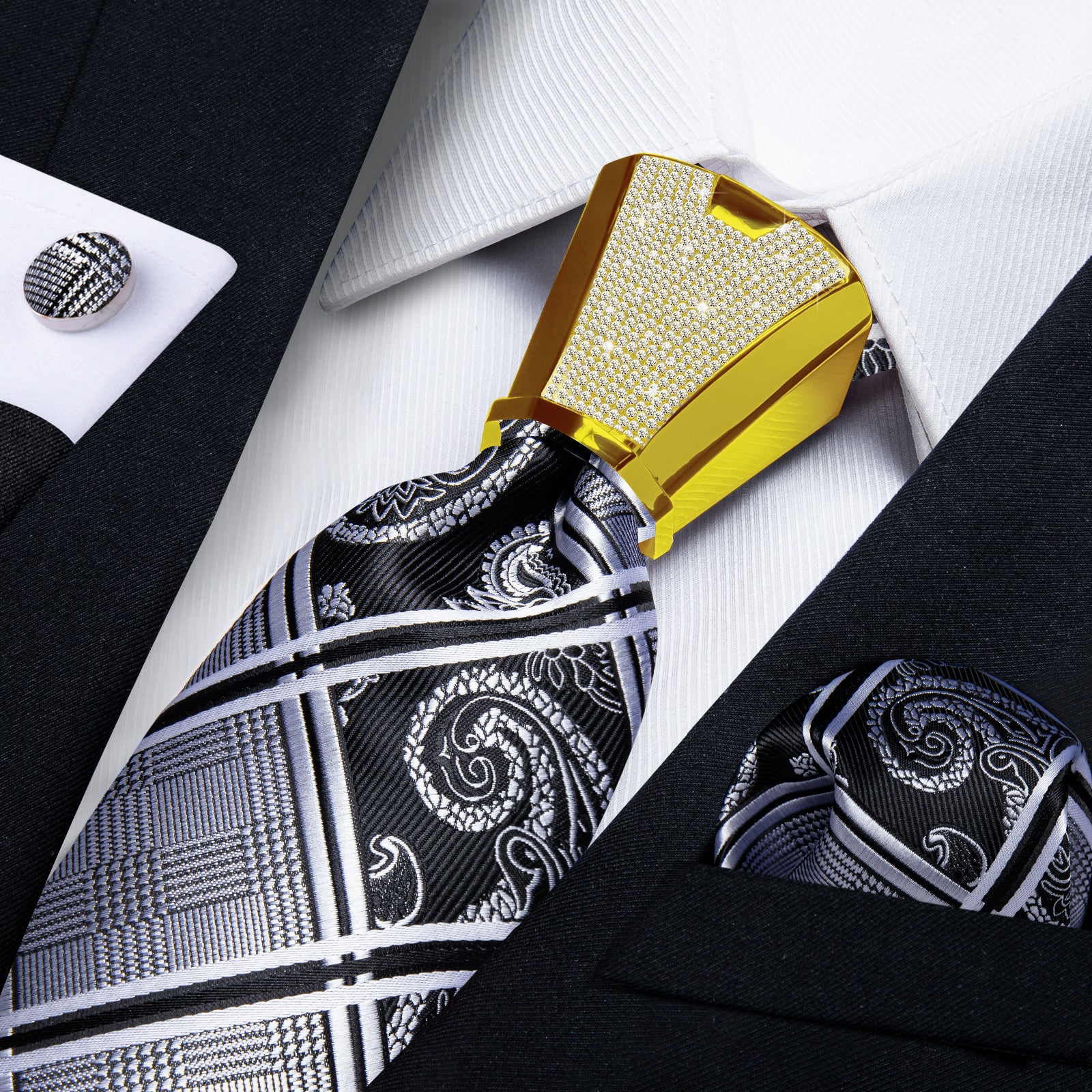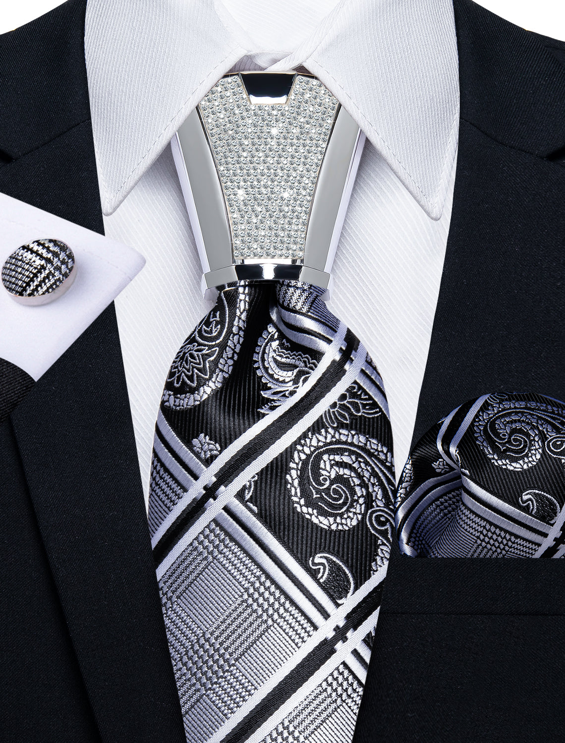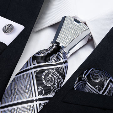 4PCS Black Silver Floral Men's Tie Handkerchief Cufflinks Accessory Set