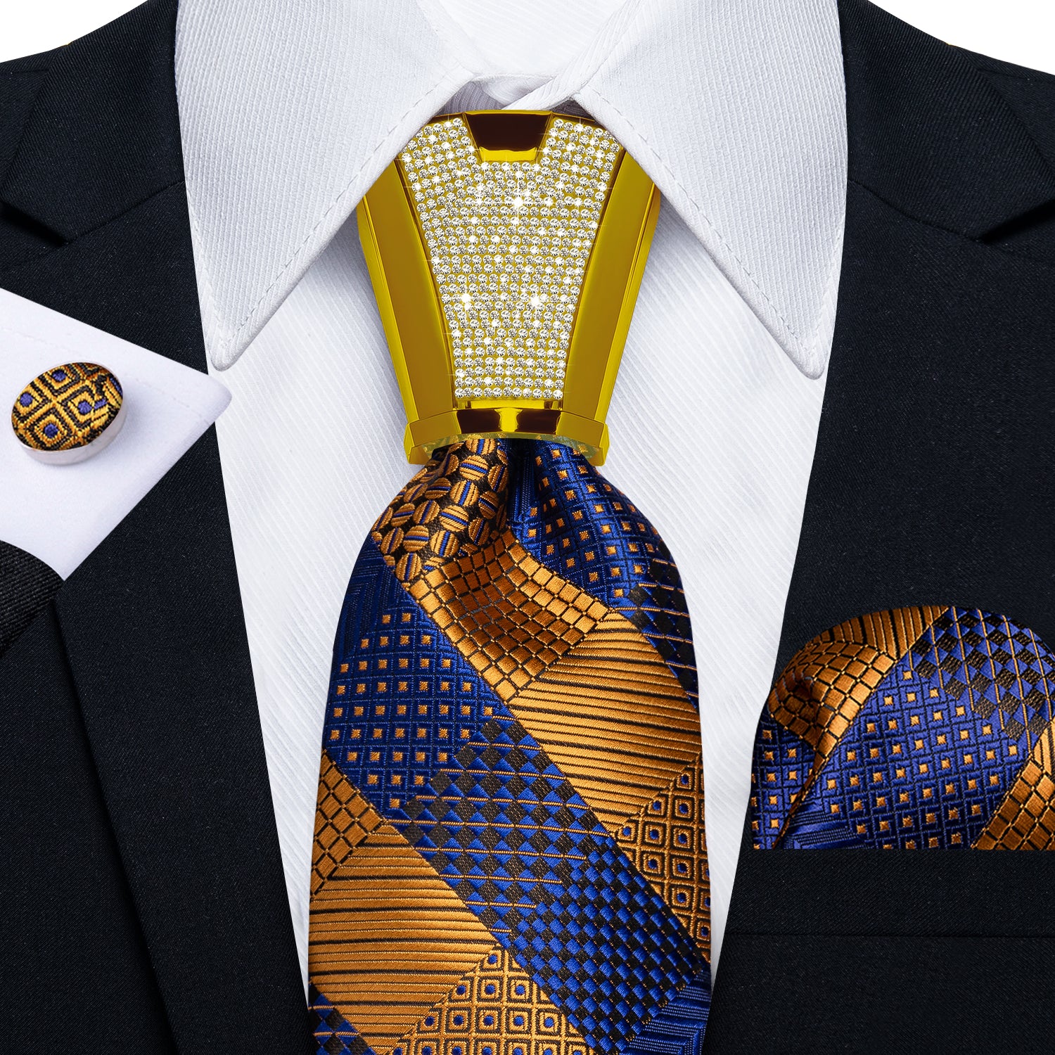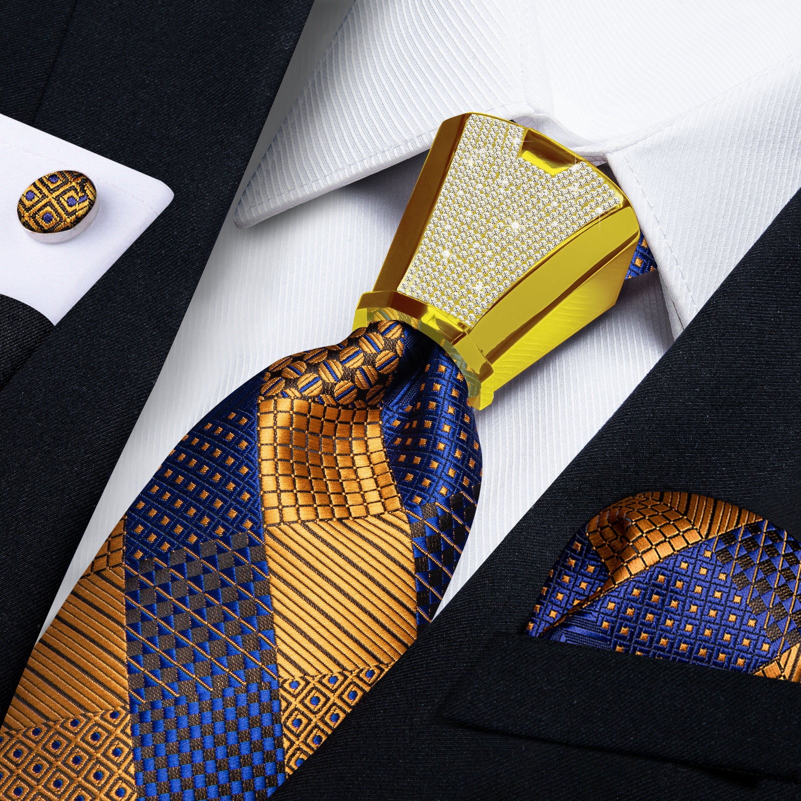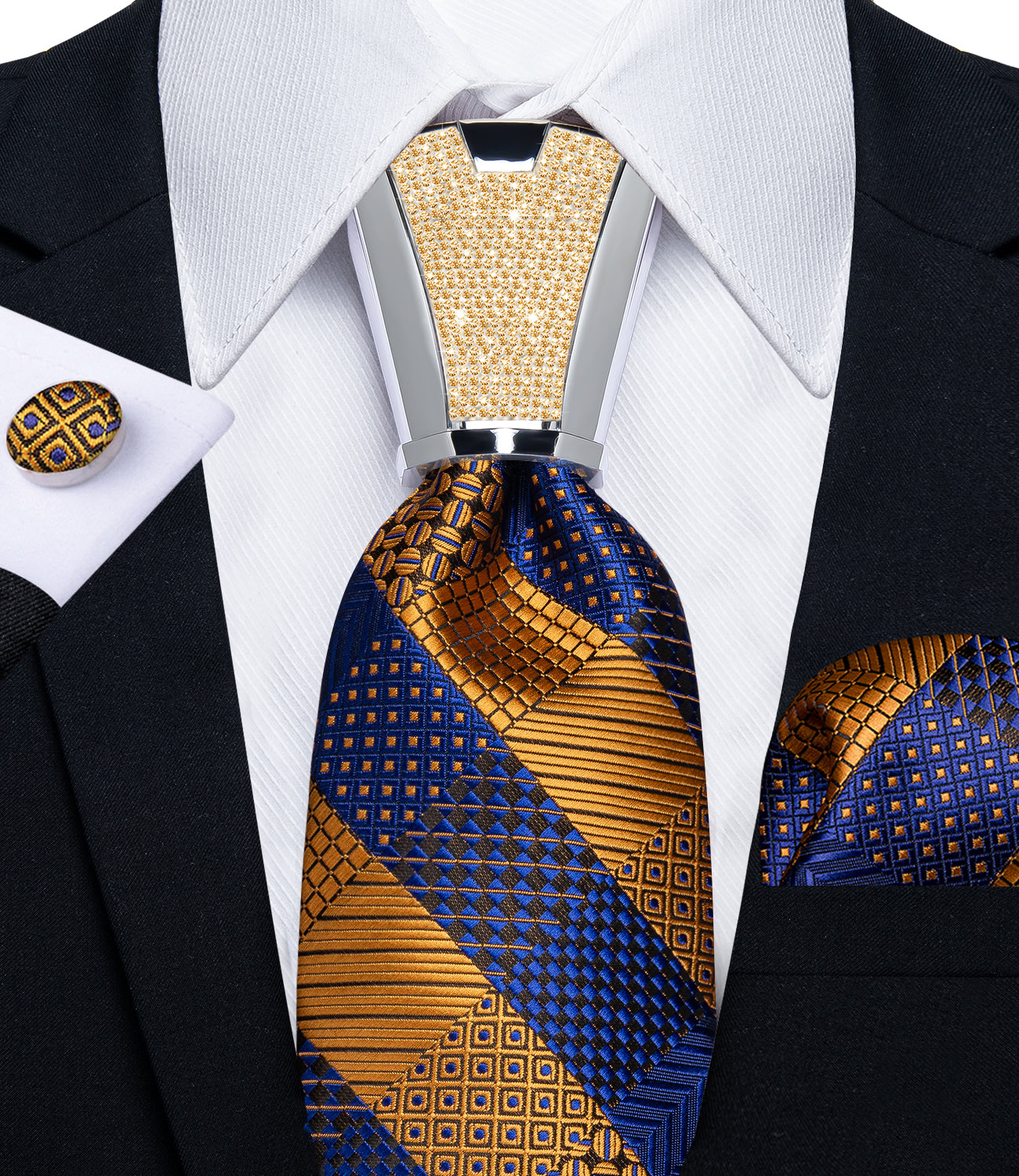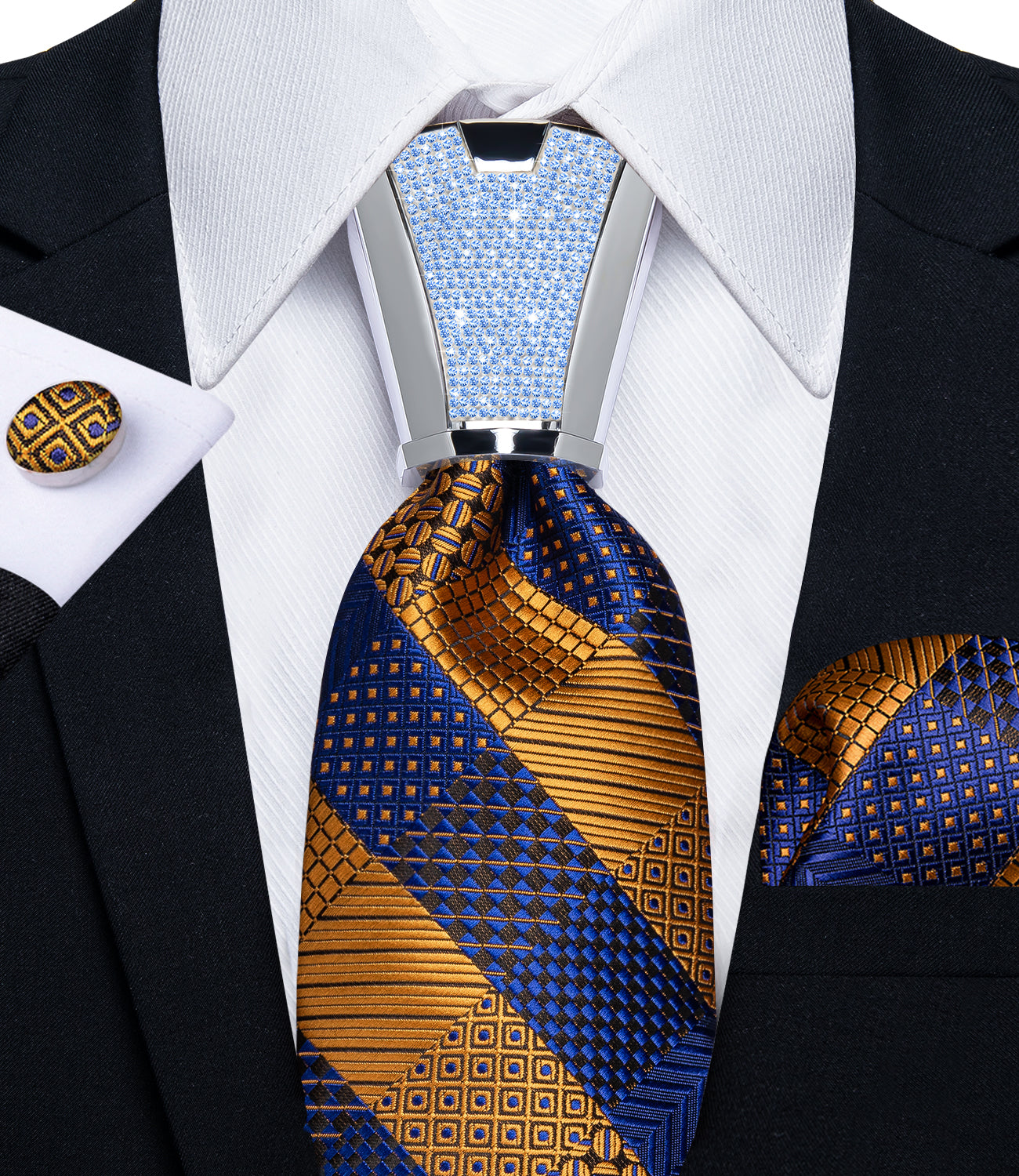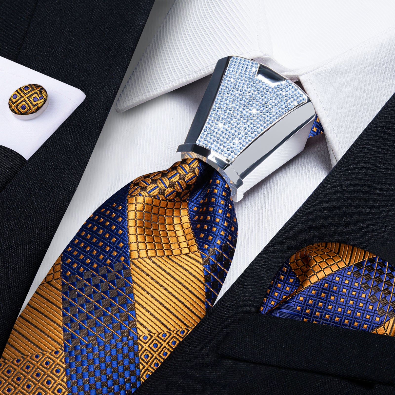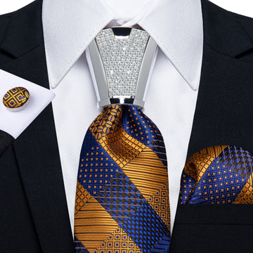 4PCS Blue Yellow Stripe Silk Men's Tie Handkerchief Cufflinks Accessory Set