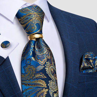 4PCS Blue Green Paisley Men's Silk Tie Handkerchief Cufflinks With Tie Ring Set