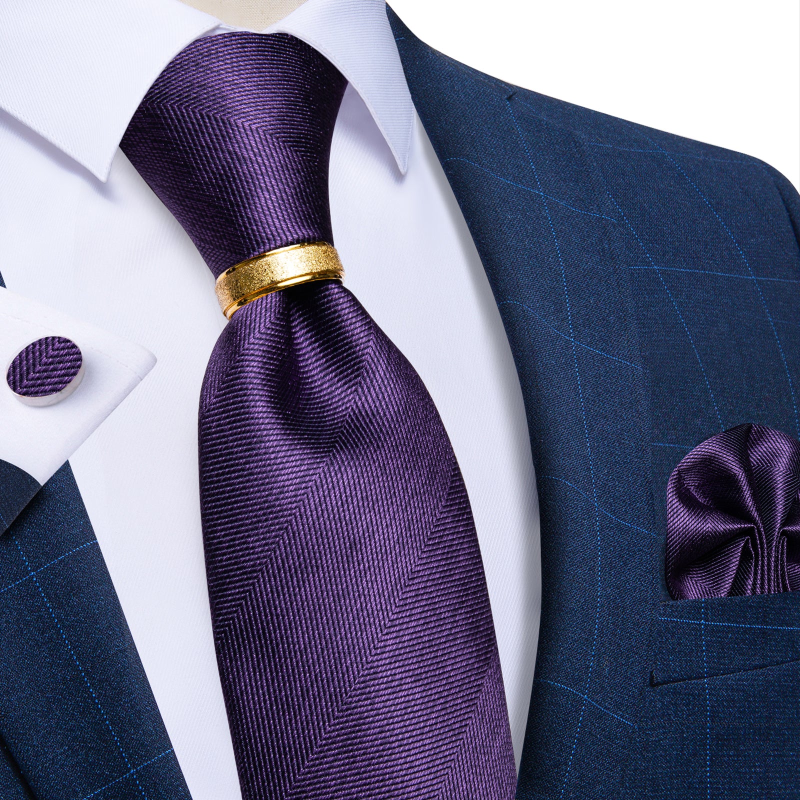 4PCS Purple Stripe Silk Men's Tie Pocket Square Cufflinks with Tie Ring Set