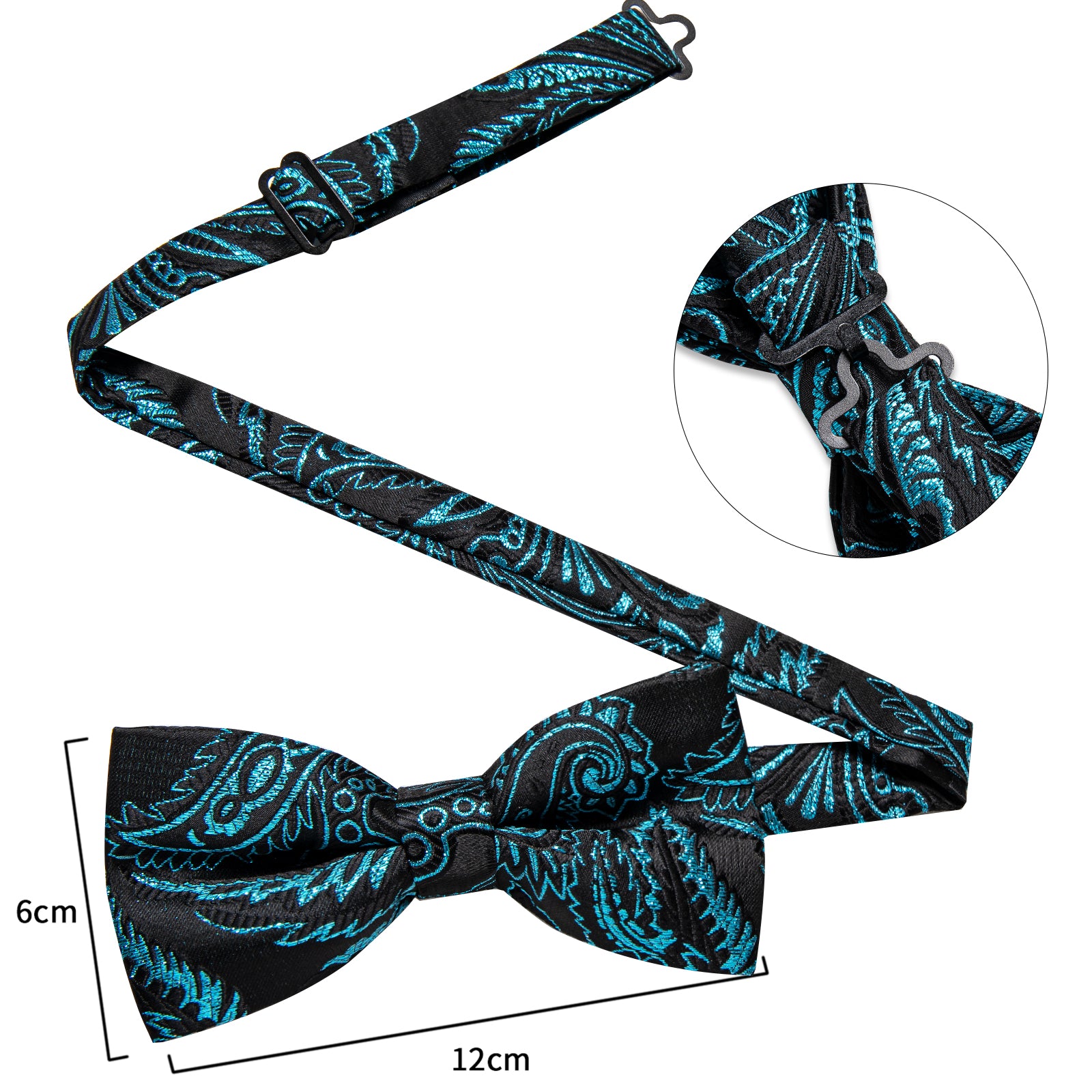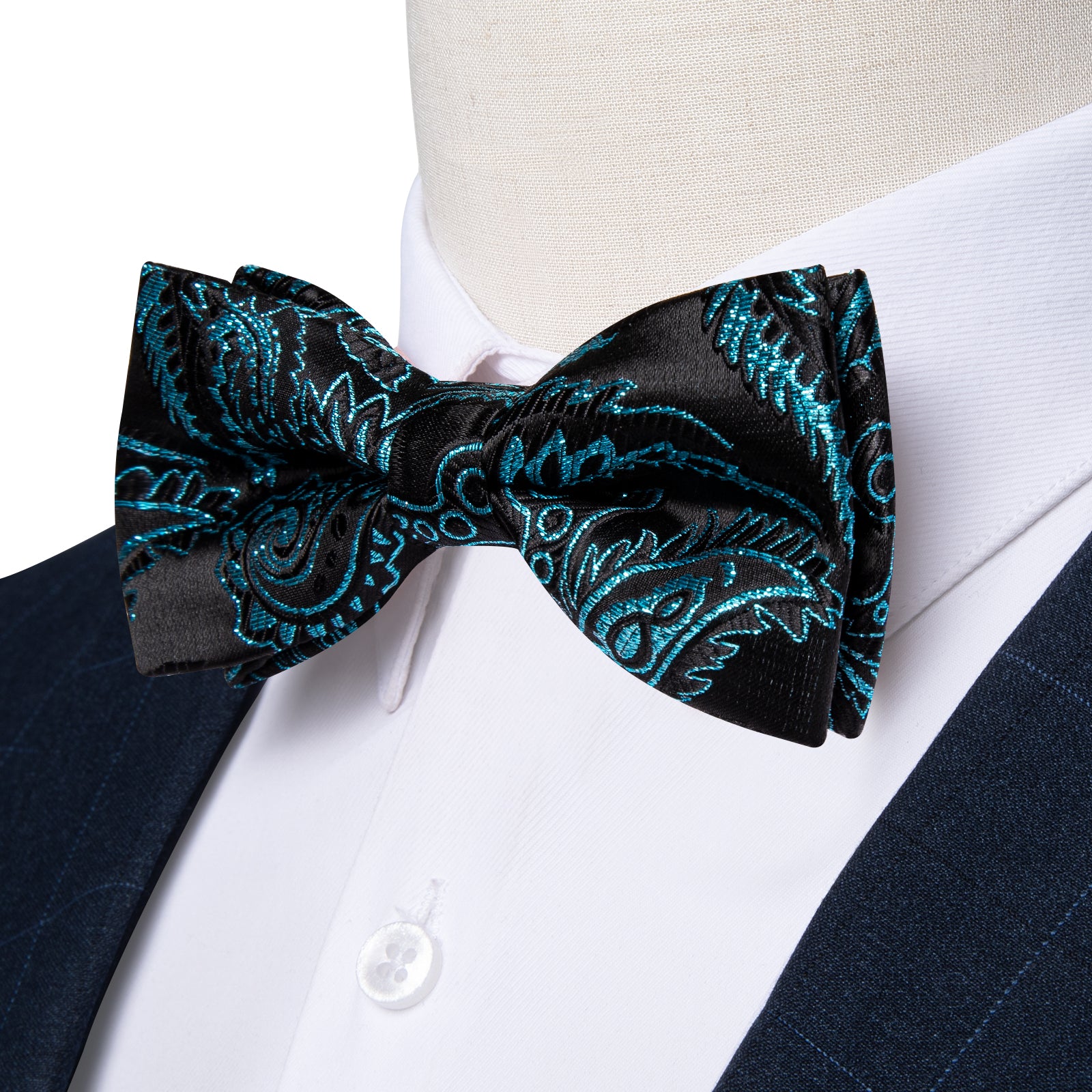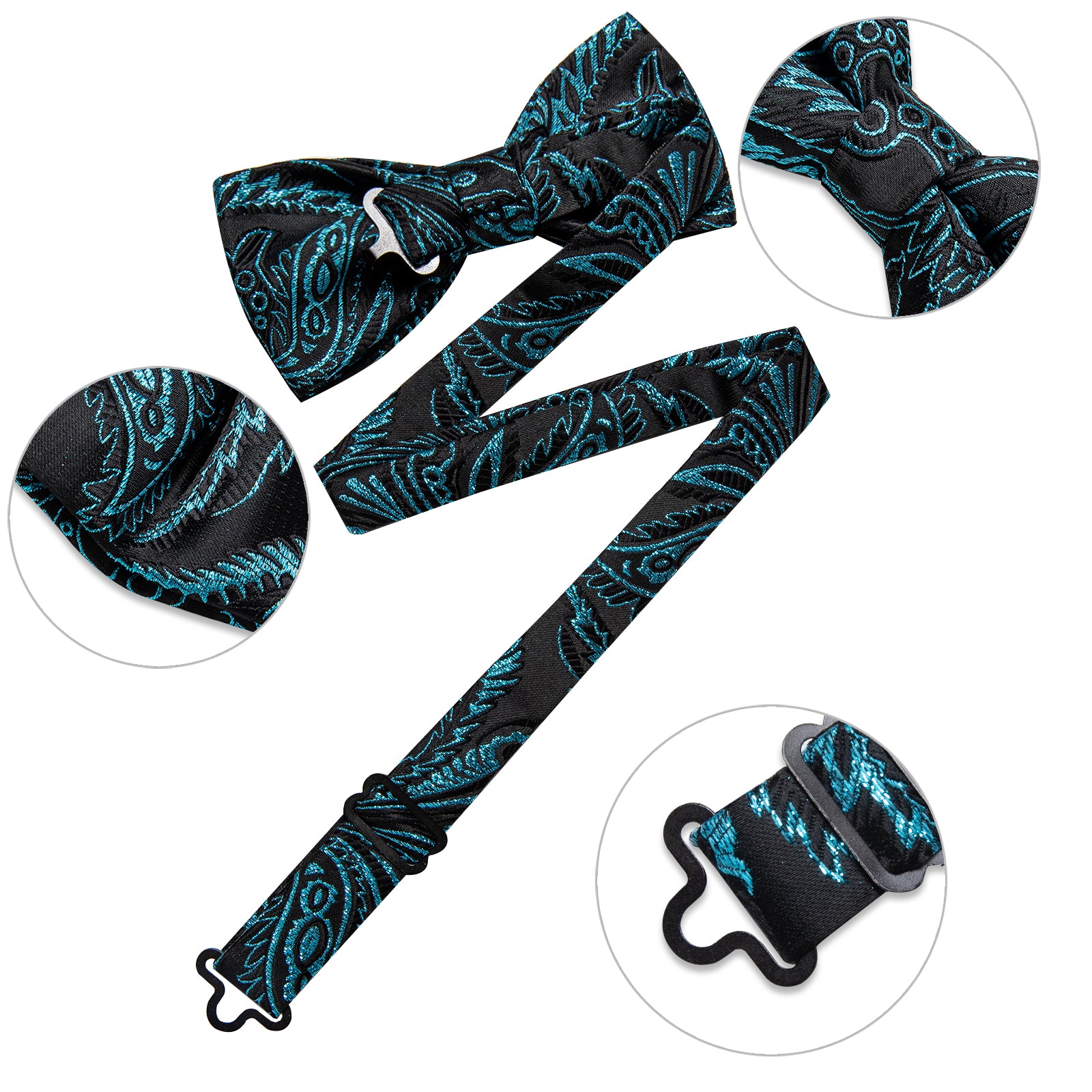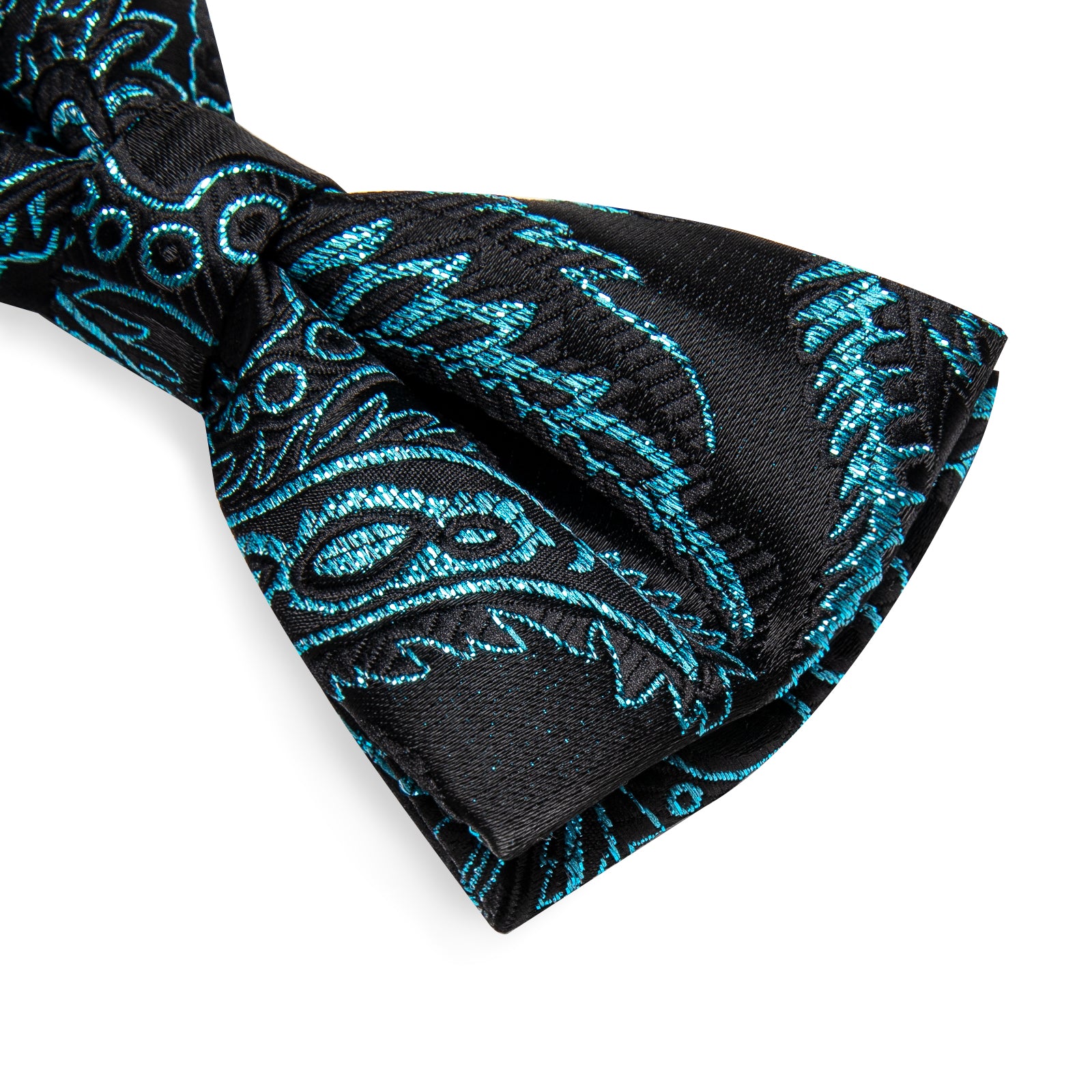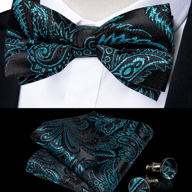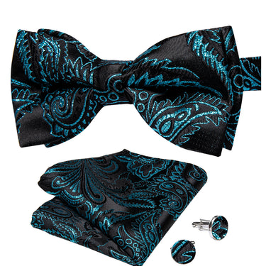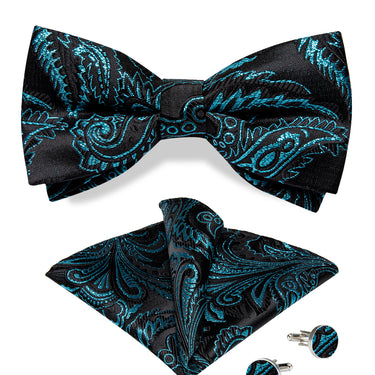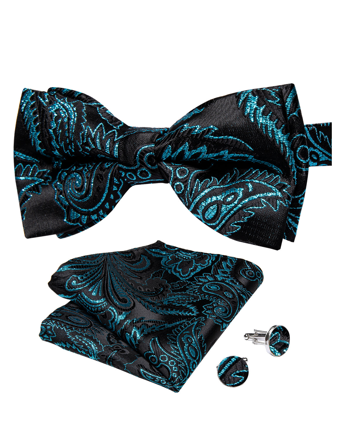 Black Blue Floral Silk Bowtie Pocket Square Cufflinks Set