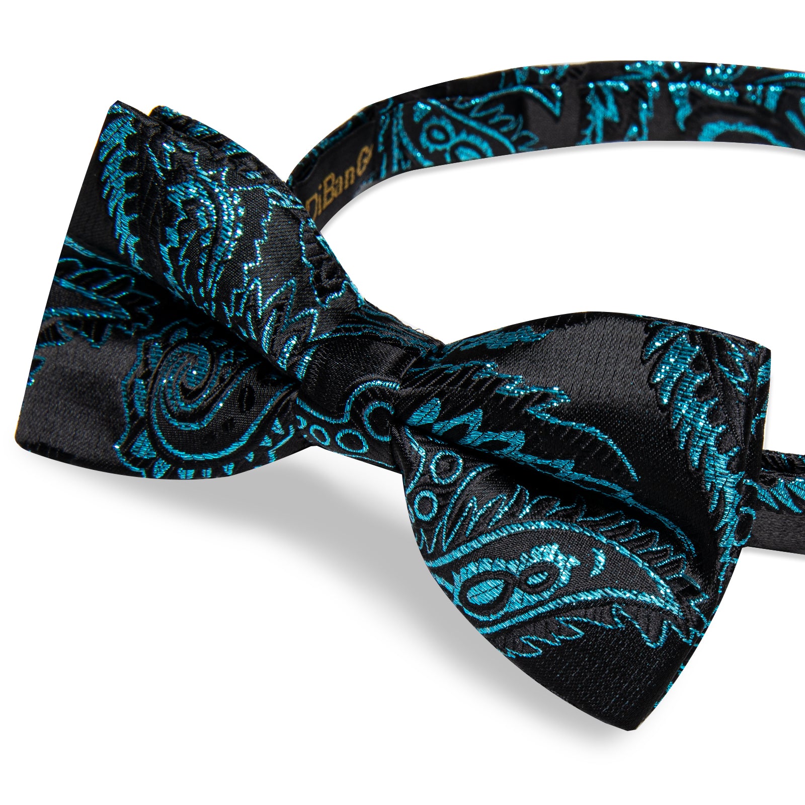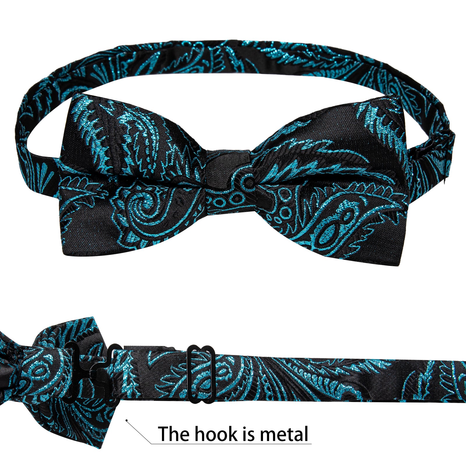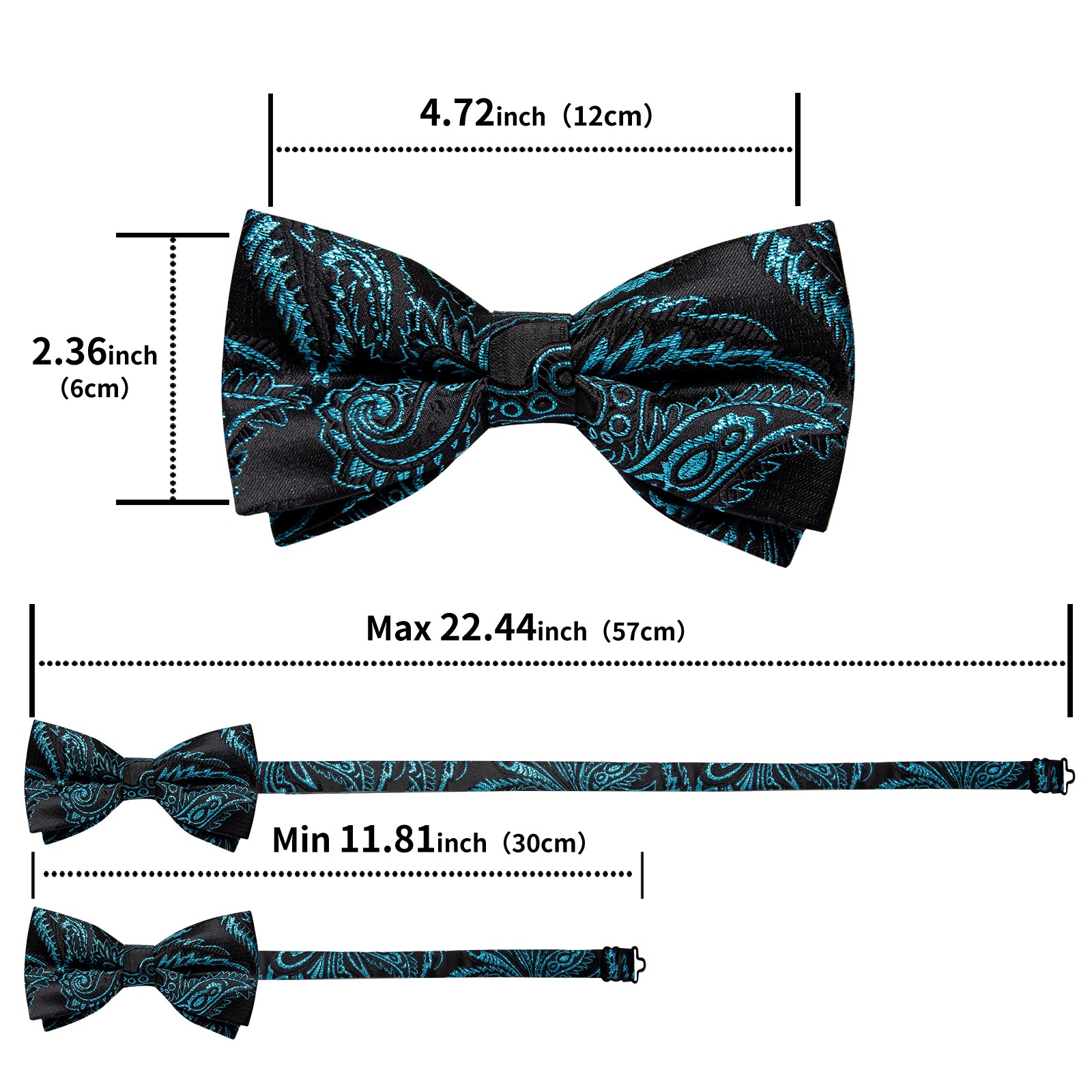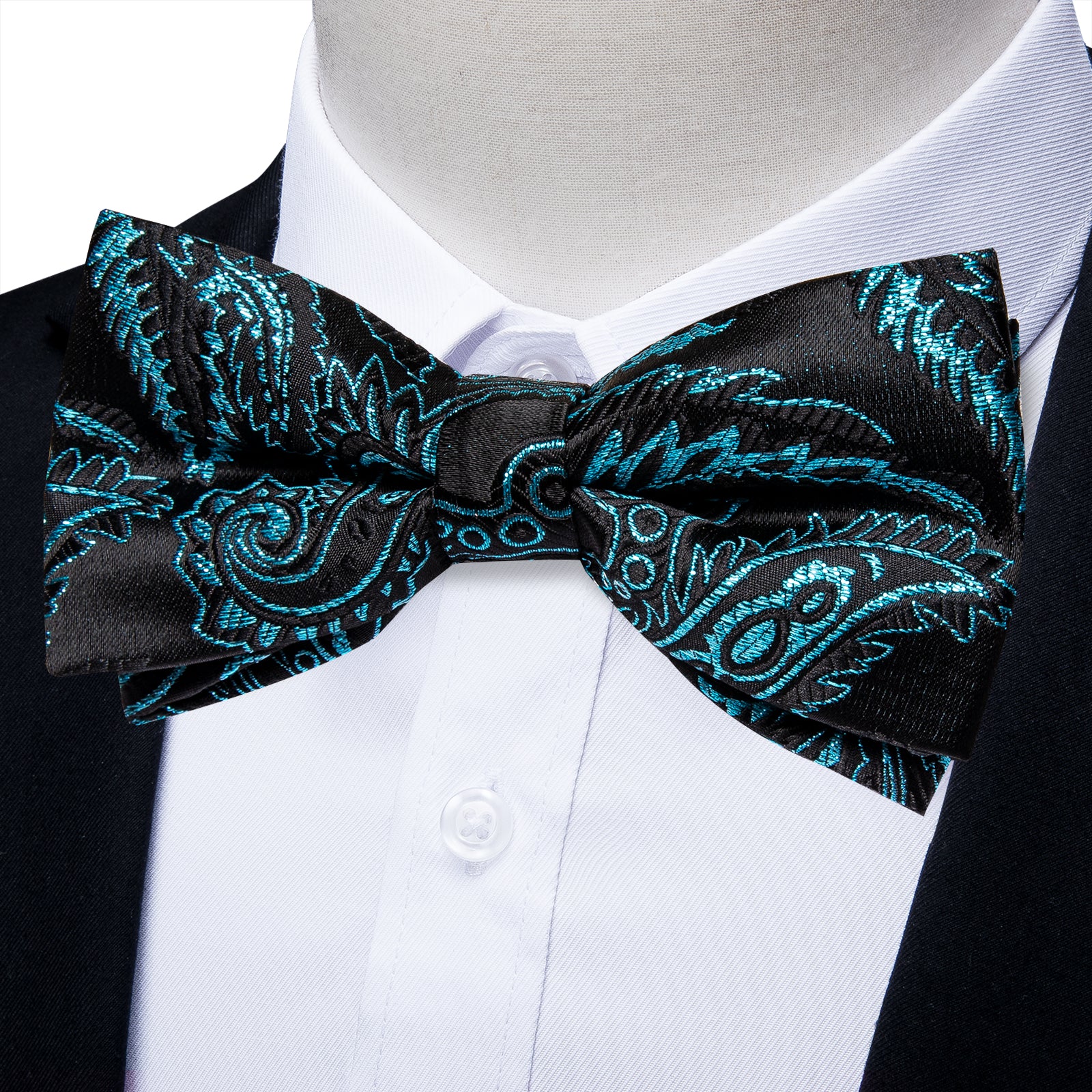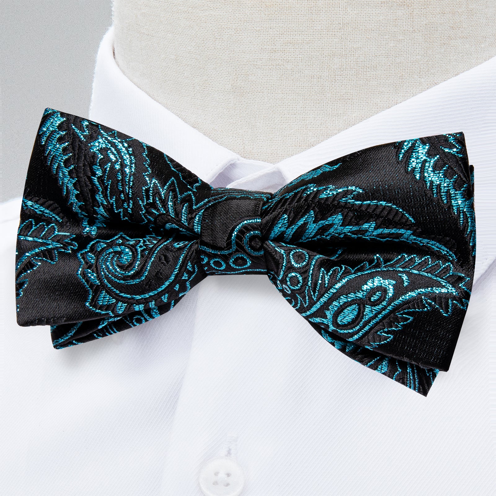 Black Blue Floral Silk Bowtie Pocket Square Cufflinks Set