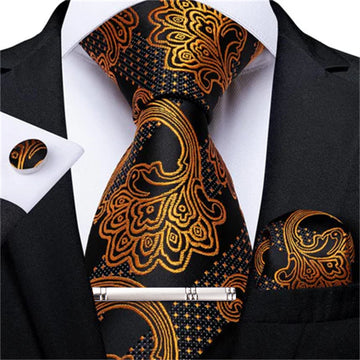 Black Brown Floral Tie Pocket Square Cufflinks Clip Set
