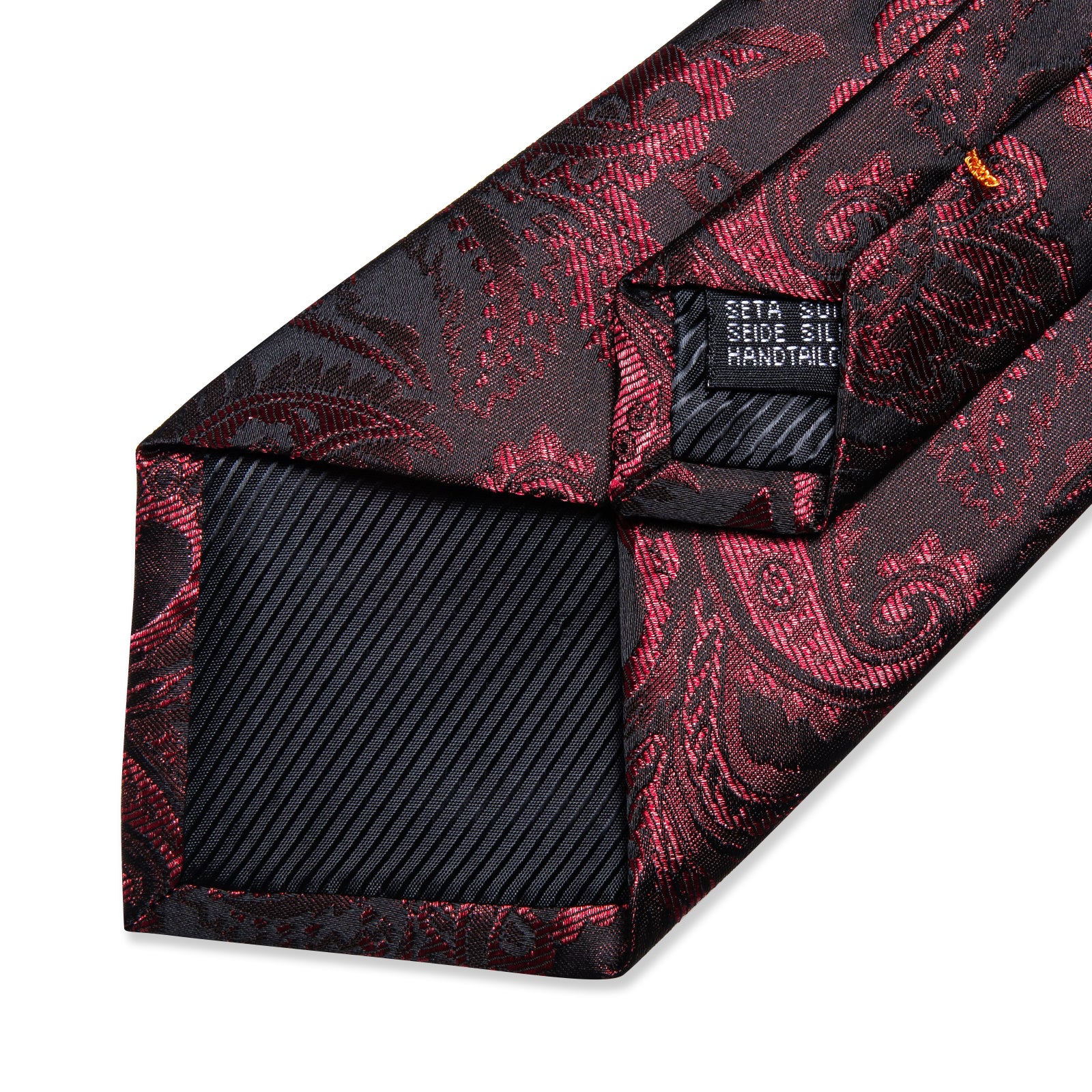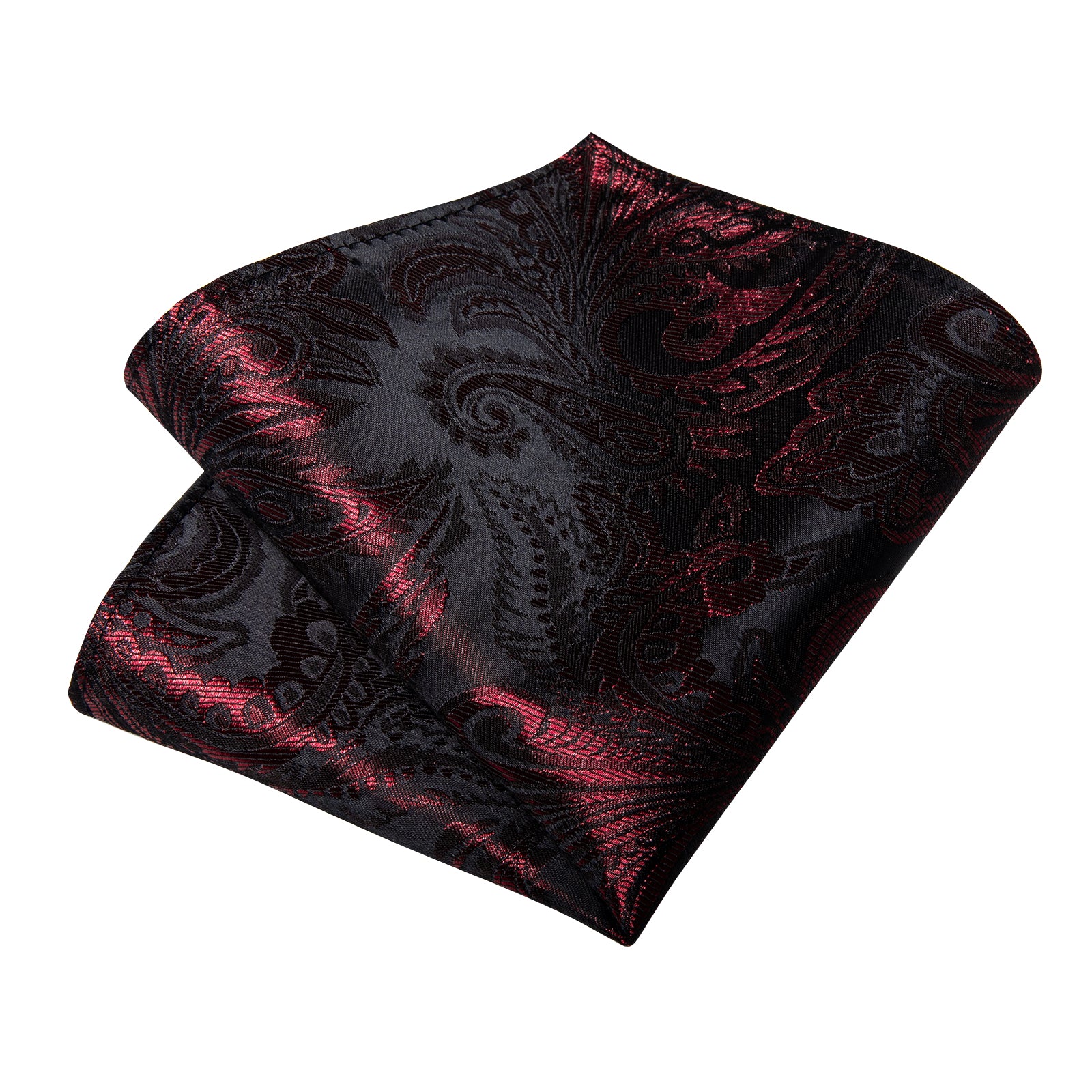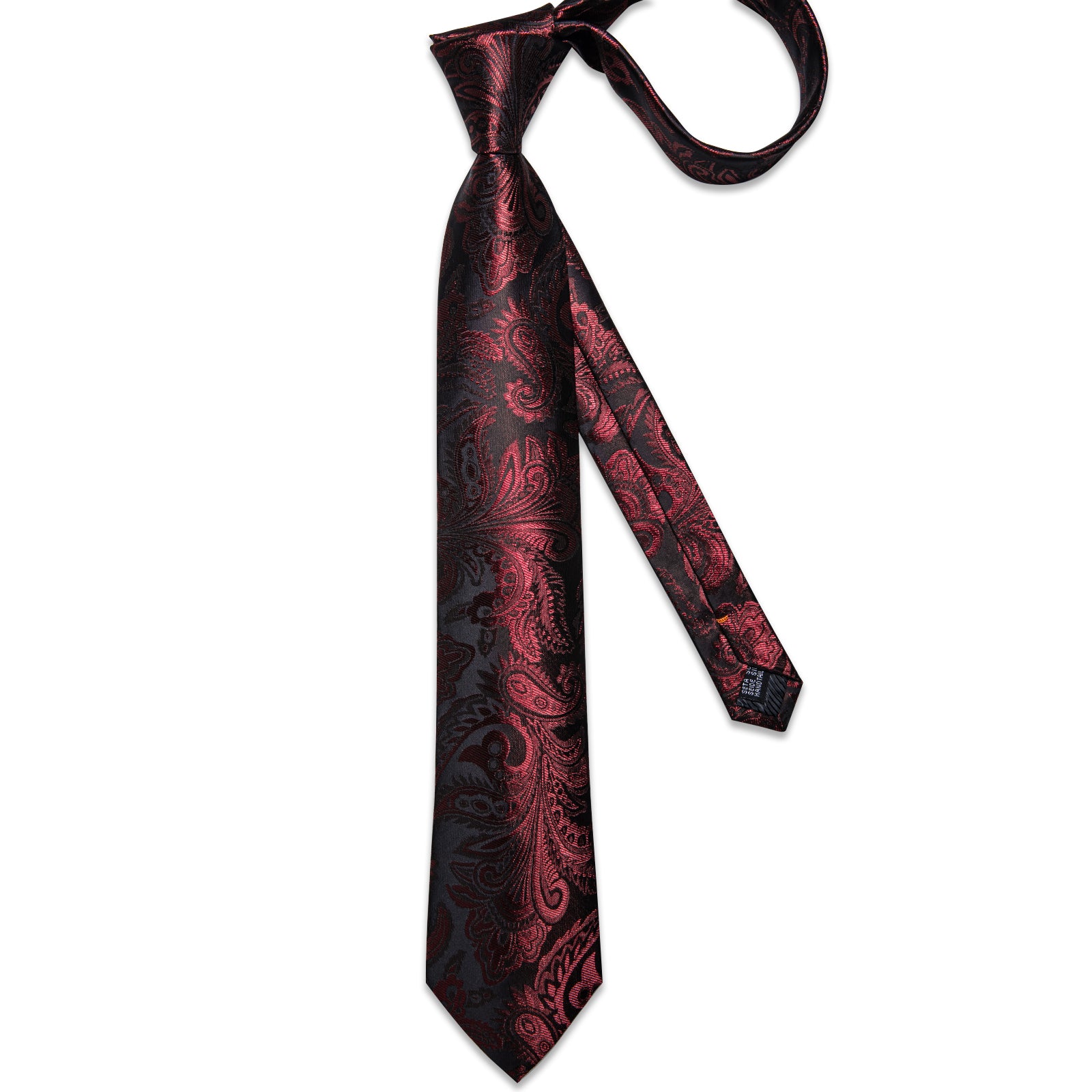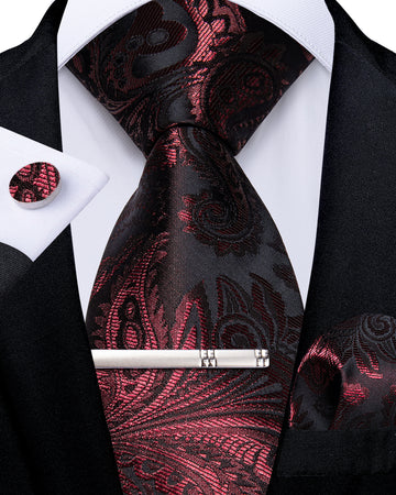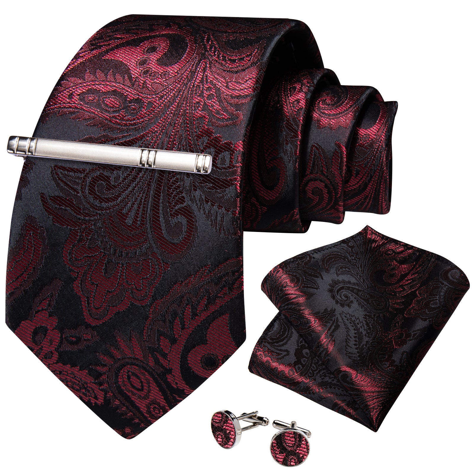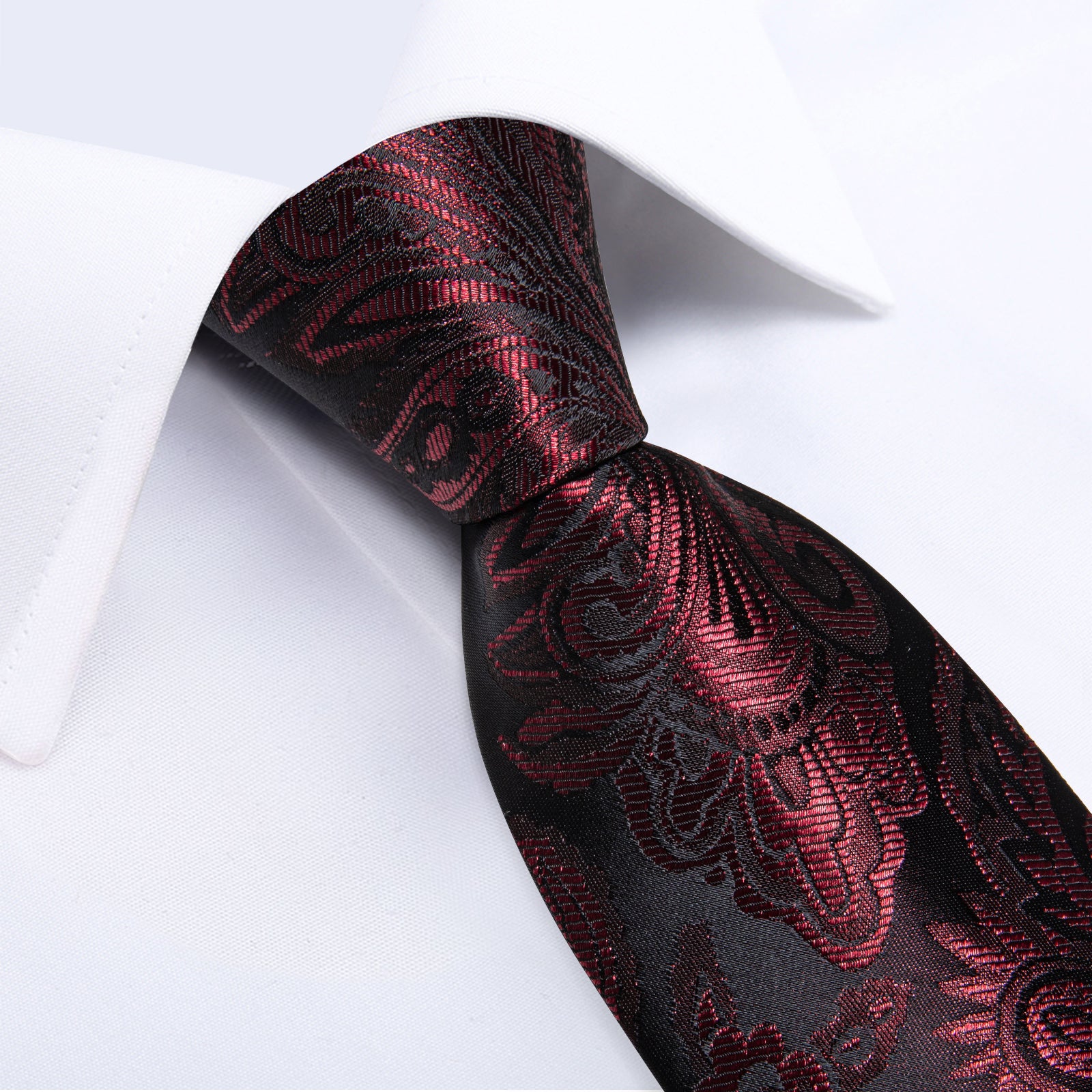Black Claret Floral Men's Tie Handkerchief Cufflinks Clip Set