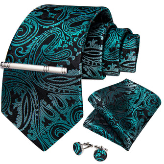 Black Green Floral Men's Tie Handkerchief Cufflinks Clip Set