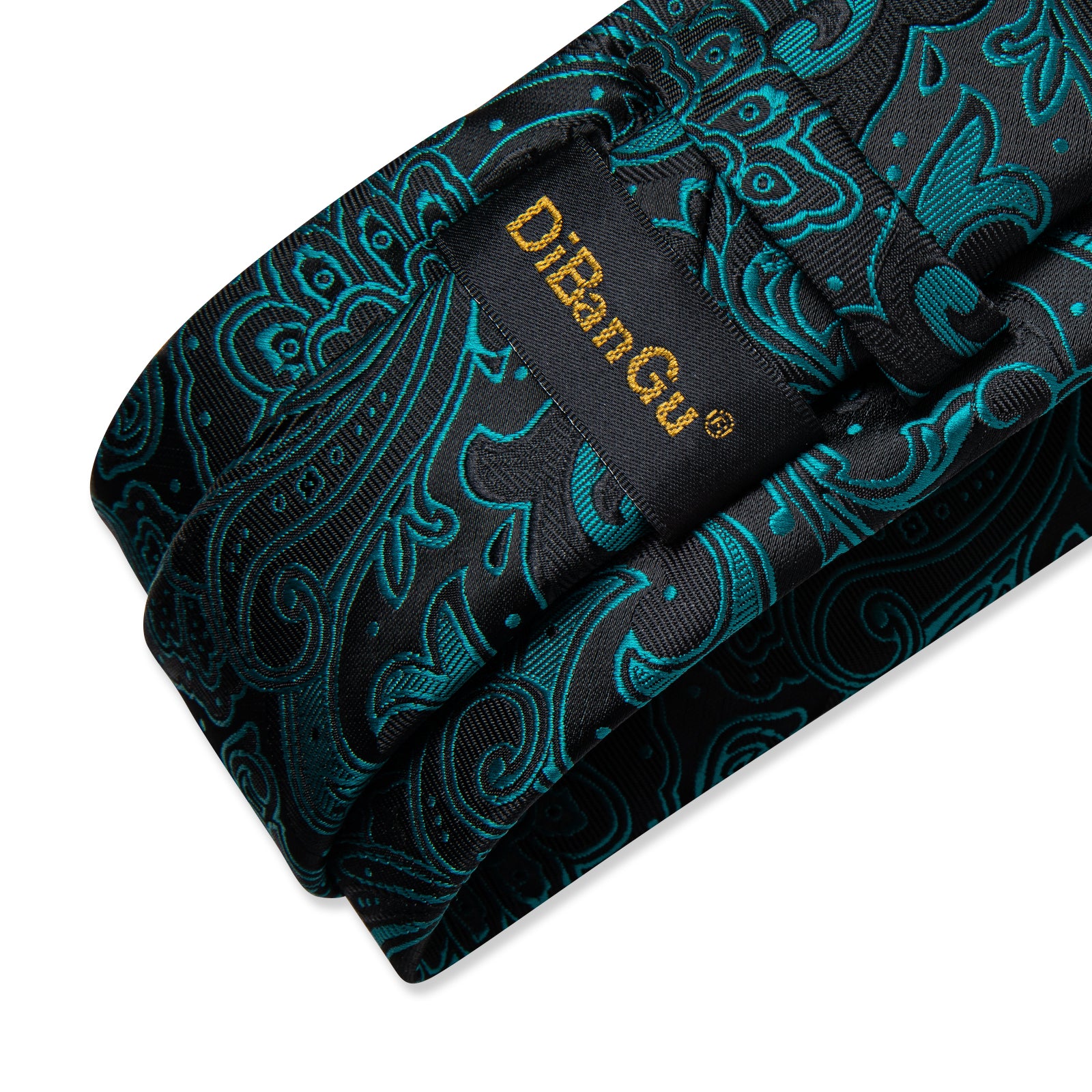 Black Green Floral Men's Tie Handkerchief Cufflinks Clip Set